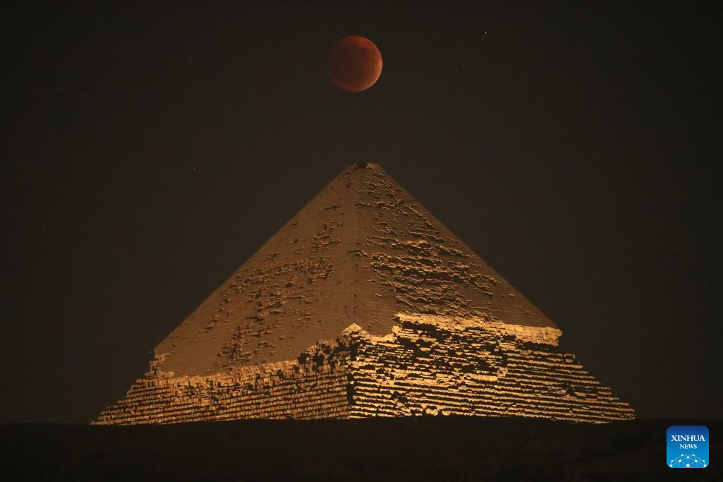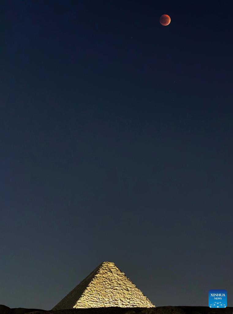 This photo taken with a mobile phone shows the moon during a lunar eclipse over the Pyramid of Khufu in Giza, Egypt, Sept. 7, 2025. (Xinhua/Wang Dongzhen)