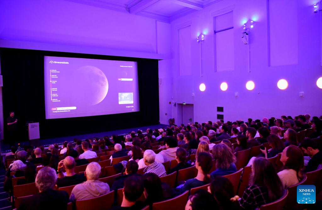 People watch the live-streaming of a lunar eclipse at Archenhold Observatory in Berlin, Germany, Sept. 7, 2025.