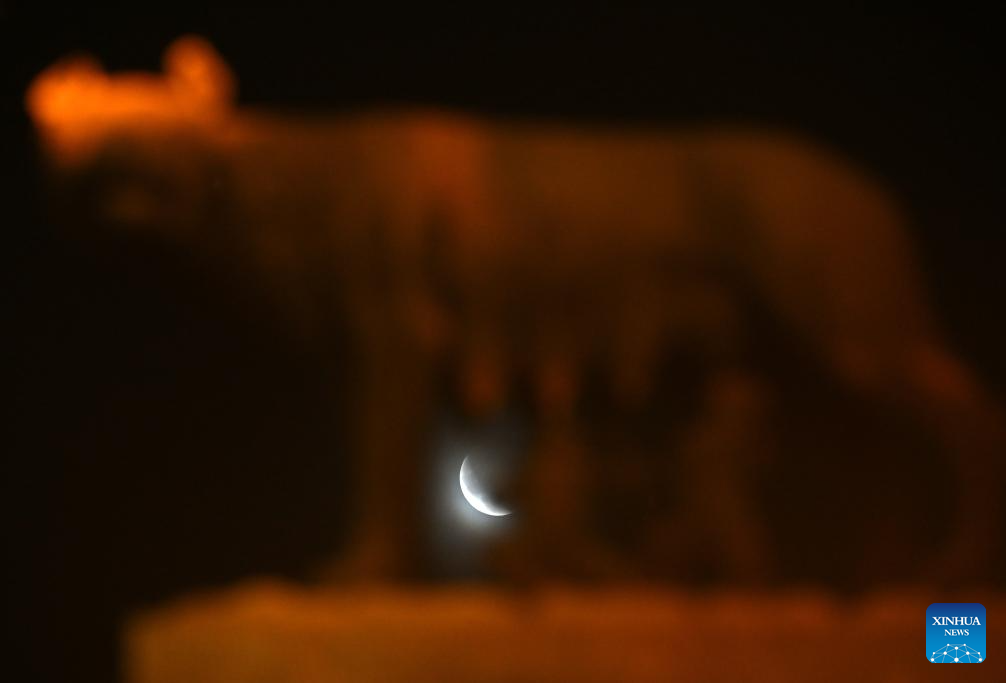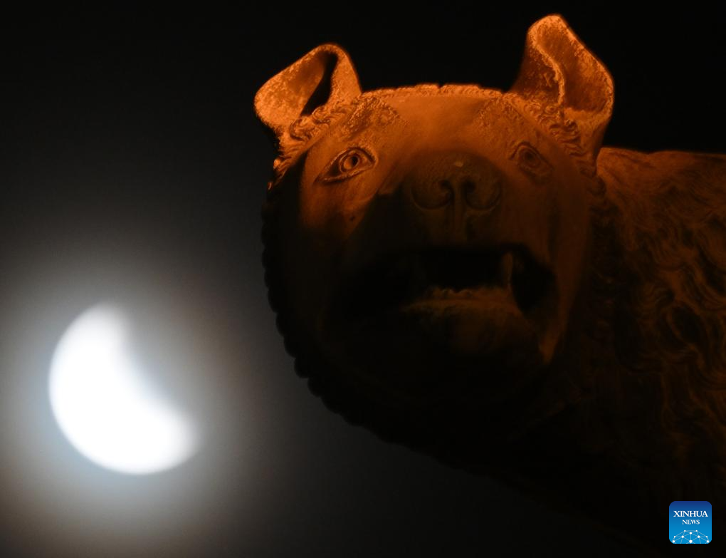 The She-wolf statue is seen with a lunar eclipse in Rome, Italy, Sept. 7, 2025. (Photo by Alberto Lingria/Xinhua)