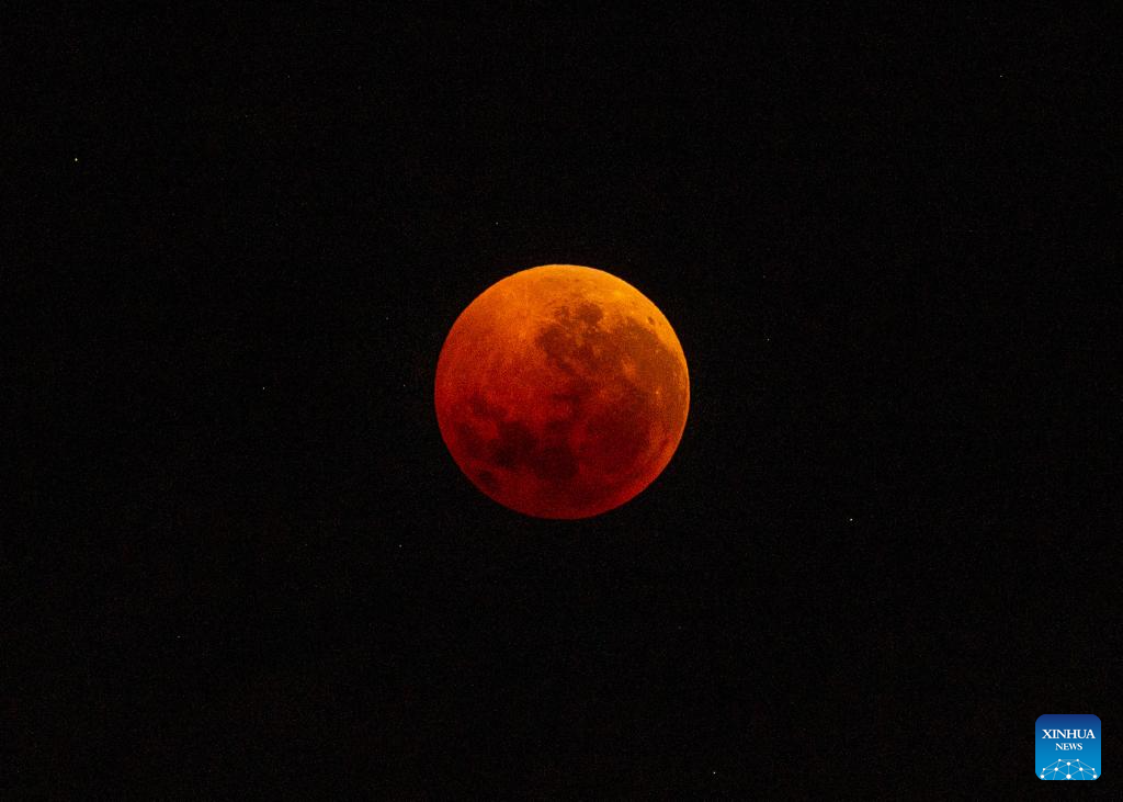The moon is seen during a total lunar eclipse in the night sky over Cape Town, South Africa, Sept. 7, 2025. (Photo by Xabiso Mkhabela/Xinhua)
