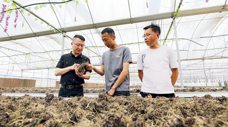 向峰(左一)為種植戶作技術(shù)指導(dǎo)。供圖/受訪者