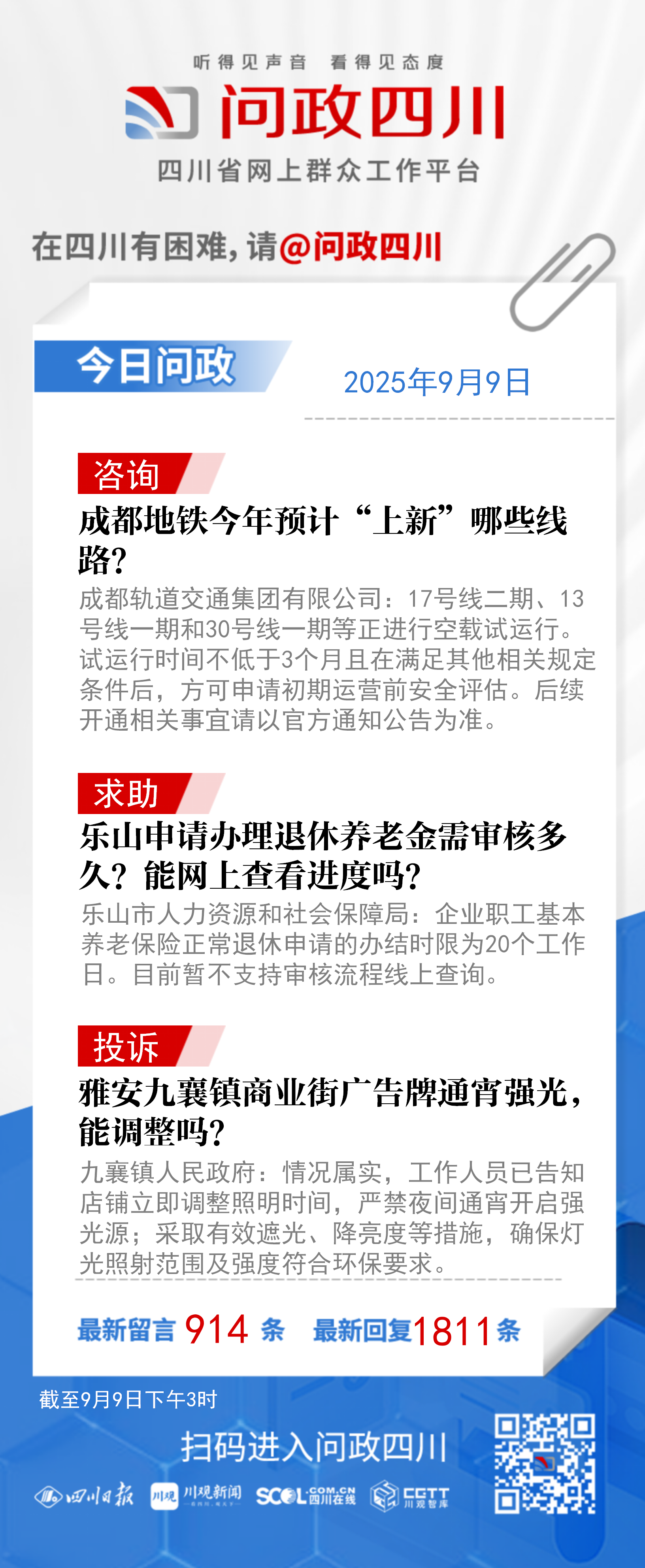 在四川有困難,找問政四川。如果您在四川遇到了操心事、煩心事、揪心事,請登錄“四川省網上群眾工作平臺—問政四川”或撥打問政四川熱線(028-96001)留言反映、求助或建議。我們將充分發揮平臺的互動聯系作用及輿論監督功能,第一時間傳遞民聲,推動問題得以及時解決——聽得見聲音,看得見態度。