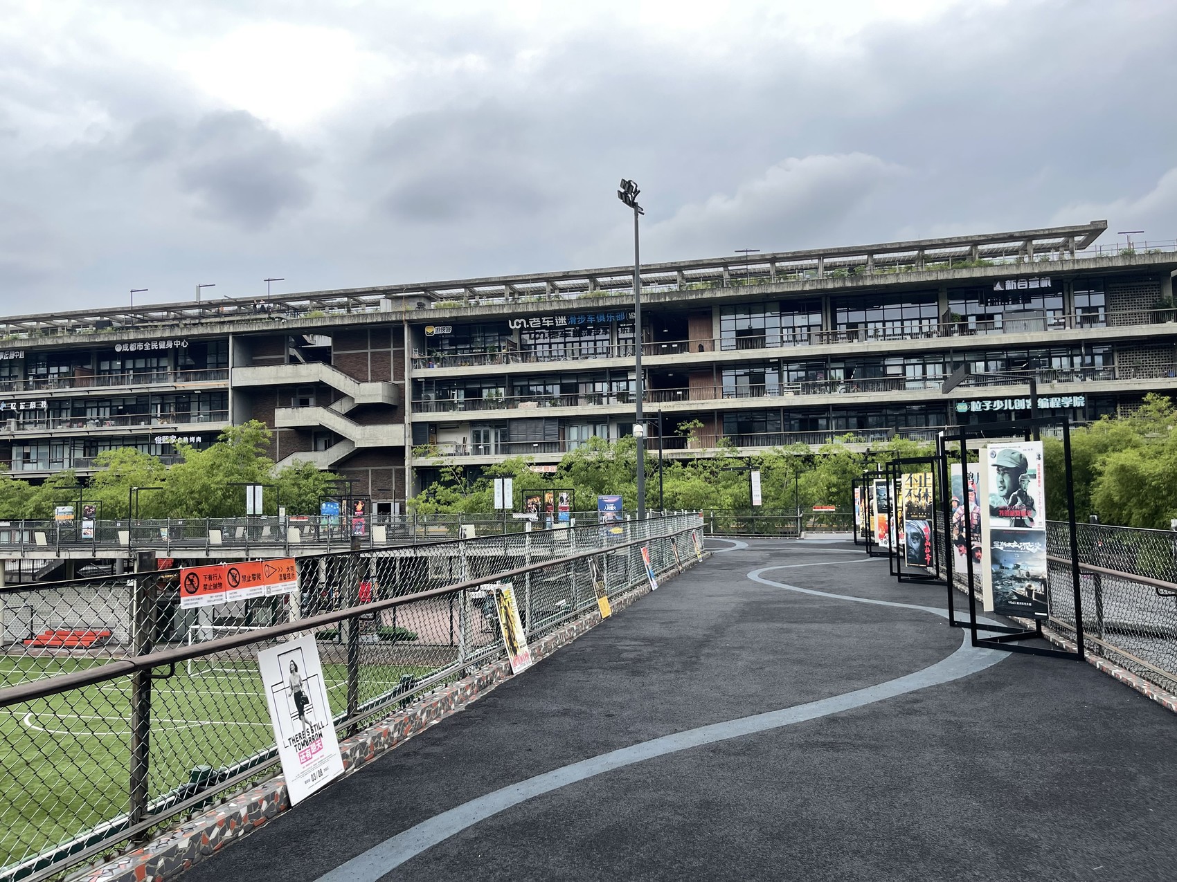 西村大院獨特的“光影建筑”空間設計,讓這場展覽超越了傳統展陳的界限。當夜幕降臨,跑道化身為露天展館,護欄成為天然畫框,燈光映照下的海報與建筑肌理相互交融。在這里,藝術鑒賞不再是靜止的凝視,而是與運動相伴的動態體驗,市民們或慢跑、或散步,在揮灑汗水的間隙與電影藝術不期而遇。