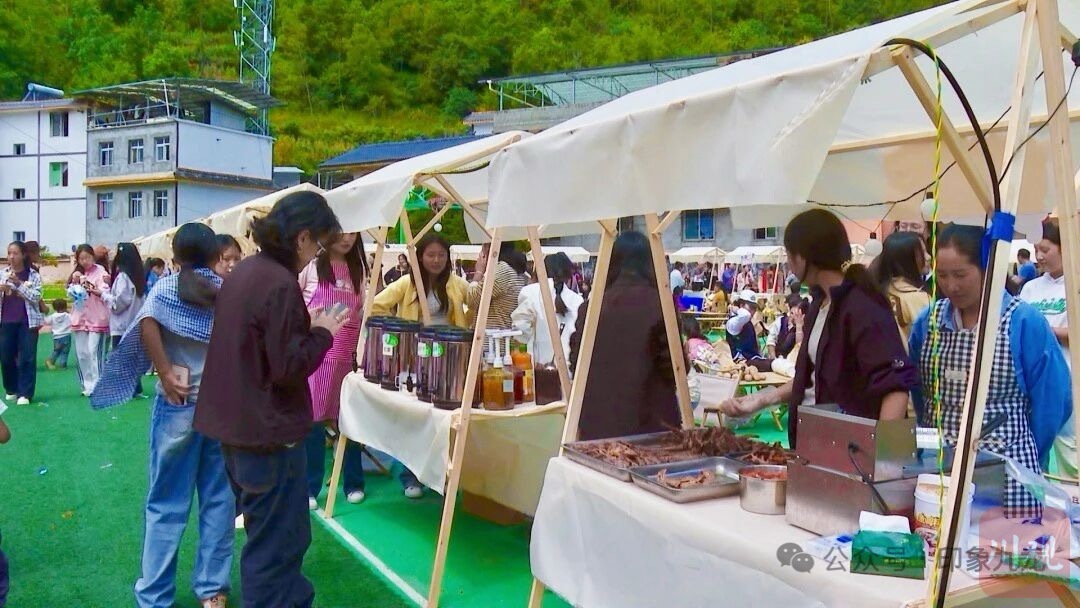 籃球場的熱鬧之外,另一側(cè)的美食節(jié)與農(nóng)產(chǎn)品市集同樣人氣爆棚。臘肉、香腸、中藏藥材等當?shù)靥禺a(chǎn)整齊碼放,村民們支起灶臺,現(xiàn)場制作青稞餅、酥油茶、手工月餅,濃郁的香氣引得來人紛紛駐足。