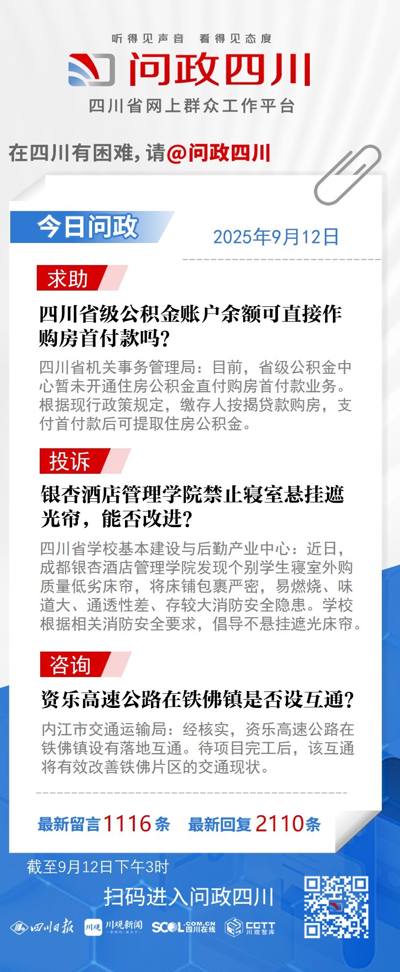 在四川有困難,找問政四川。如果您在四川遇到了操心事、煩心事、揪心事,請登錄“四川省網(wǎng)上群眾工作平臺—問政四川”或撥打問政四川熱線(028-96001)留言反映、求助或建議。我們將充分發(fā)揮平臺的互動聯(lián)系作用及輿論監(jiān)督功能,第一時間傳遞民聲,推動問題得以及時解決——聽得見聲音,看得見態(tài)度。