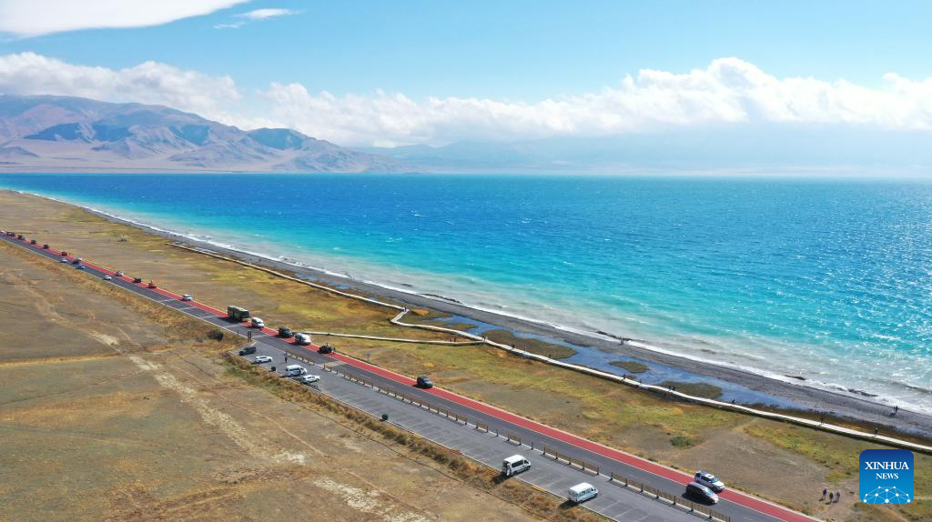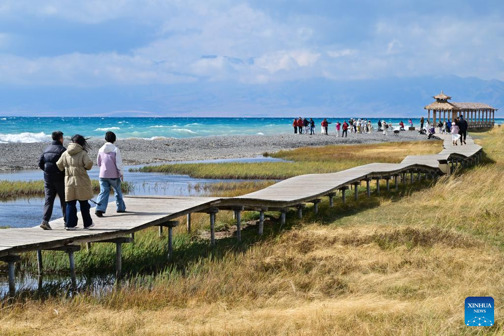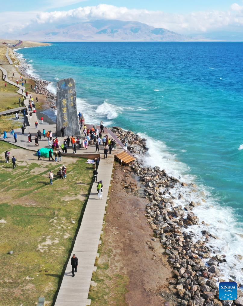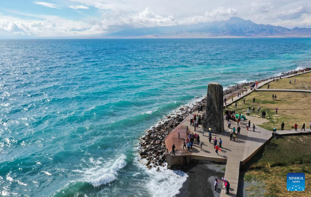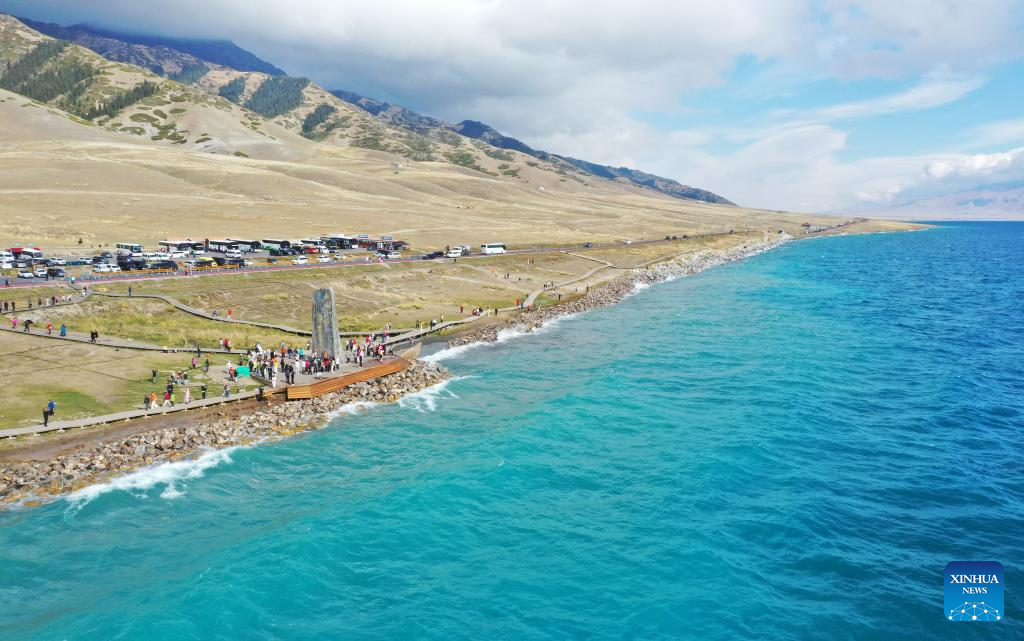 Tourists visit the Sayram Lake scenic area in Bortala Mongolian Autonomous Prefecture, northwest China's Xinjiang Uygur Autonomous Region, Sept. 11, 2025. (Xinhua/Li He)