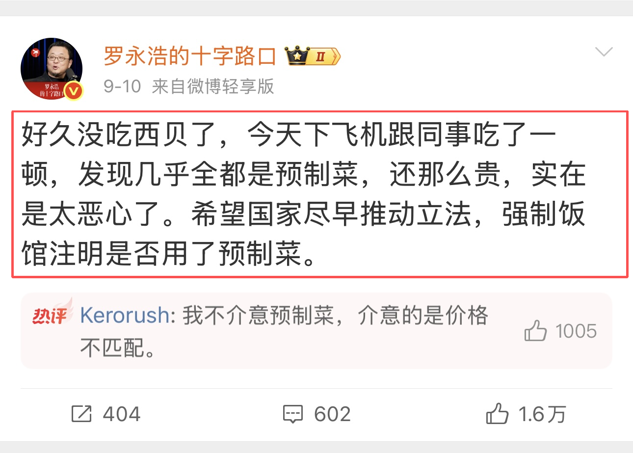 爭議焦點的本質是價值與價格的錯位。有網友在羅永浩微博評論:“我不介意預制菜,介意的是價格不匹配?!蔽溯^多點贊。這表明,消費者對預制菜的抵觸,并非針對預制菜本身,而是源于“高價現制”的預期與“標準化預制”之間的落差。當人均消費過百的餐廳大量使用預制菜,卻未被明確告知時,消費者會產生“被騙感”。羅永浩的吐槽之所以引發共鳴,正是擊中了這種普遍心理——人們愿意為廚師現炒的鍋氣付費,卻不愿為工業化復熱的料理包支付溢價。