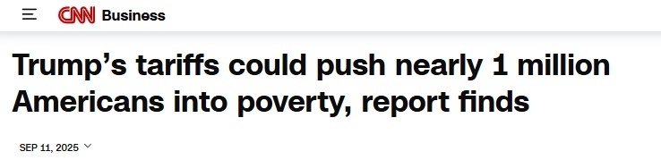 中國日報網9月12日電 美國有線電視新聞網(CNN)11日報道指出,特朗普政府的關稅政策在推高聯邦收入的同時,恐導致顯著的社會成本。耶魯大學預算實驗室最新分析顯示,這一系列政策或使近百萬美國人陷入貧困。