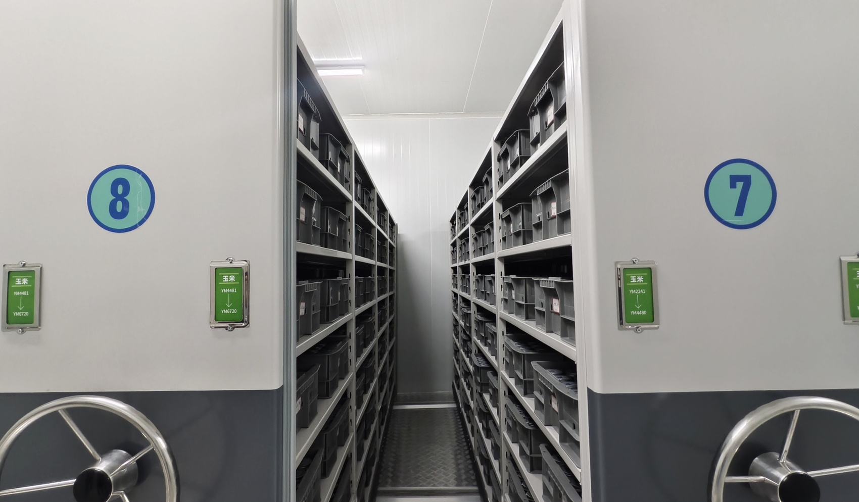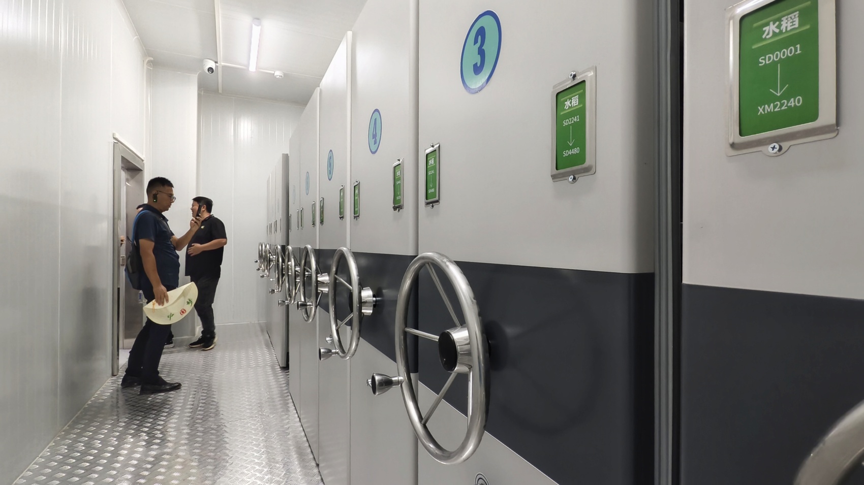 步入庫房,一排排厚重的儲存柜整齊排列。只需輕輕轉動柜體上的轉向盤,就能移動柜體、取用種子。拉開儲存柜抽屜,一袋袋封裝完好的種子映入眼簾,包裝上清晰標注著入庫時間、重量和獨一無二的“身份證號”。