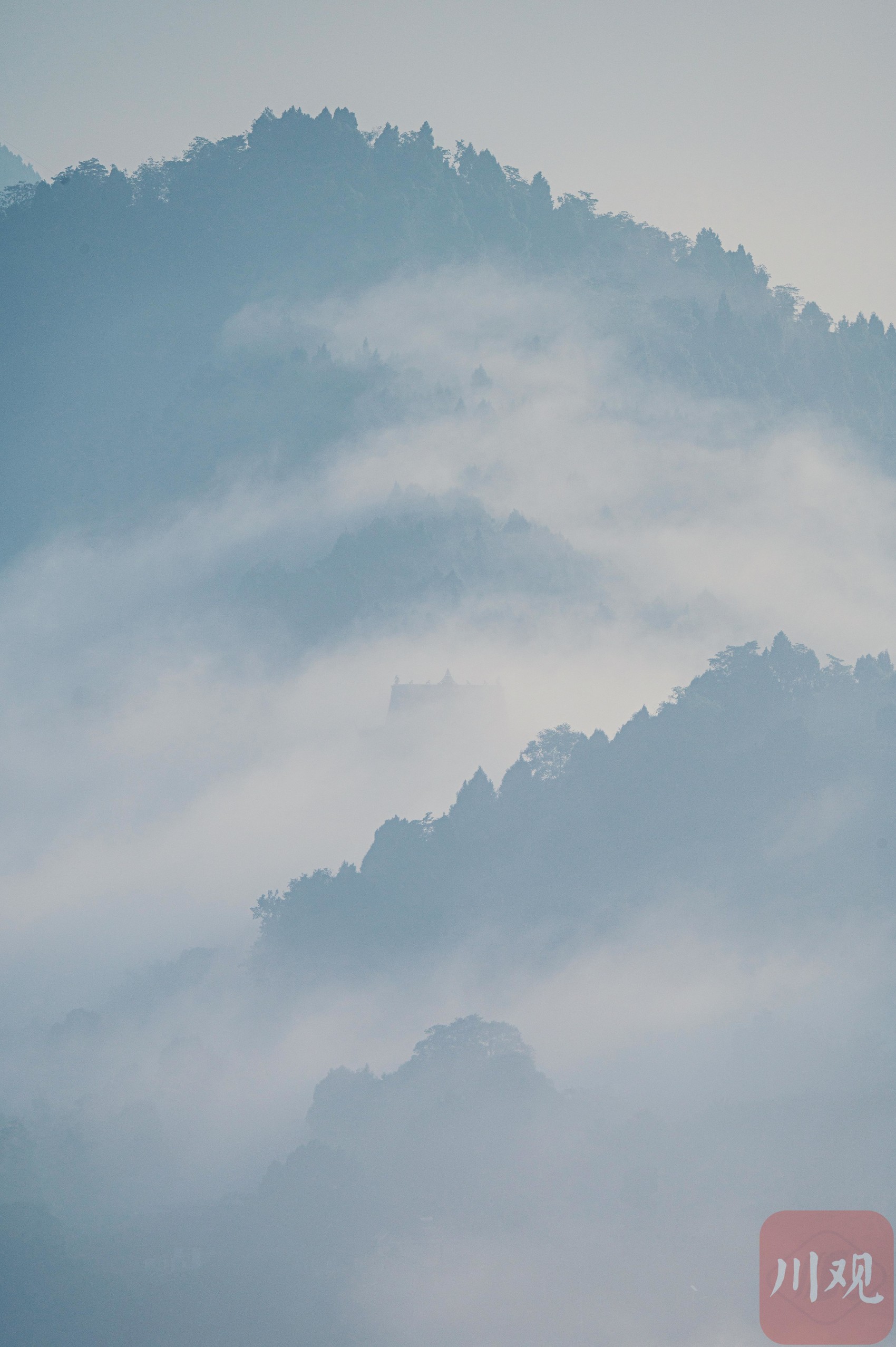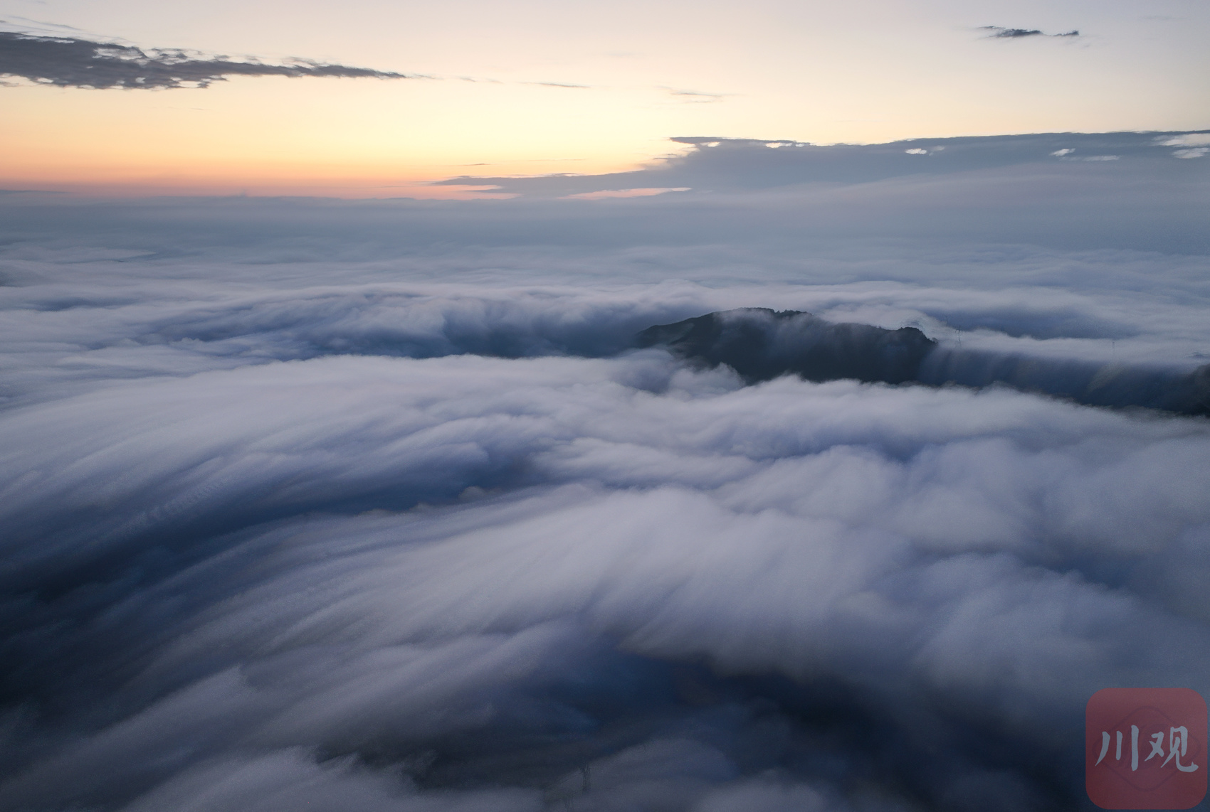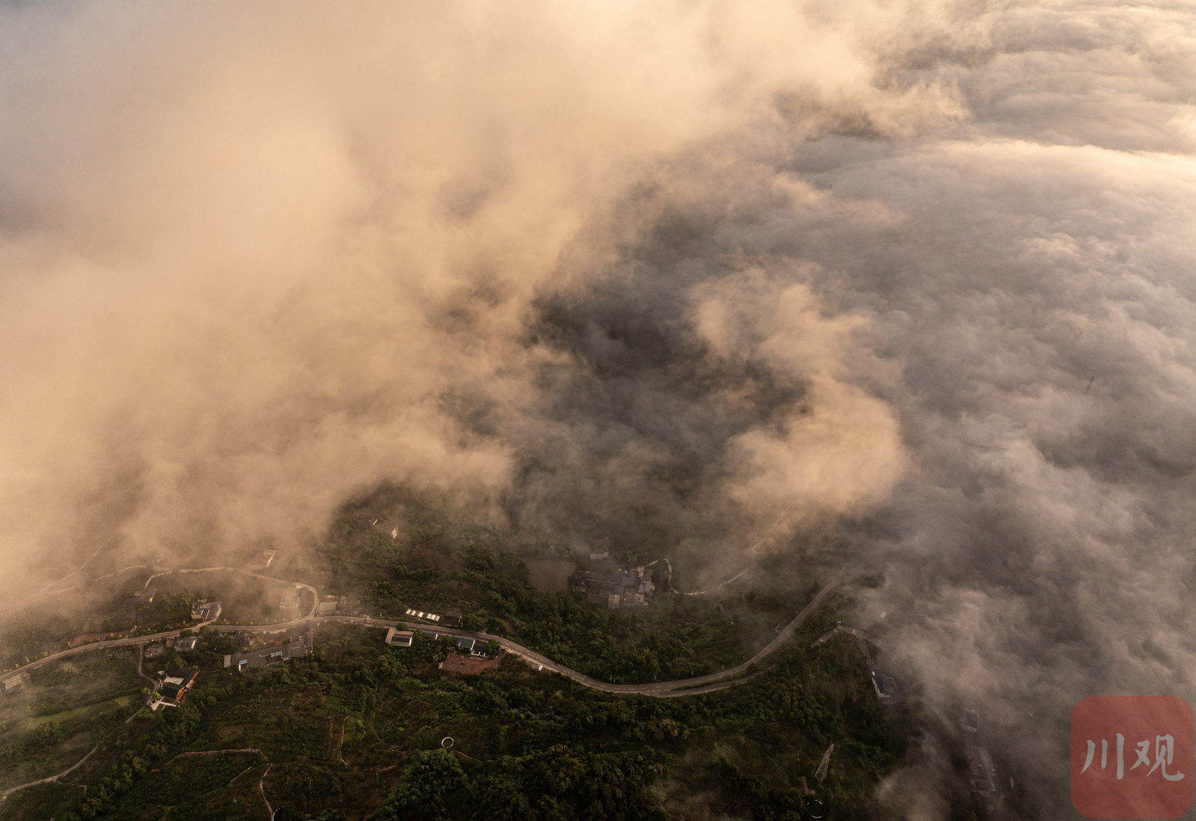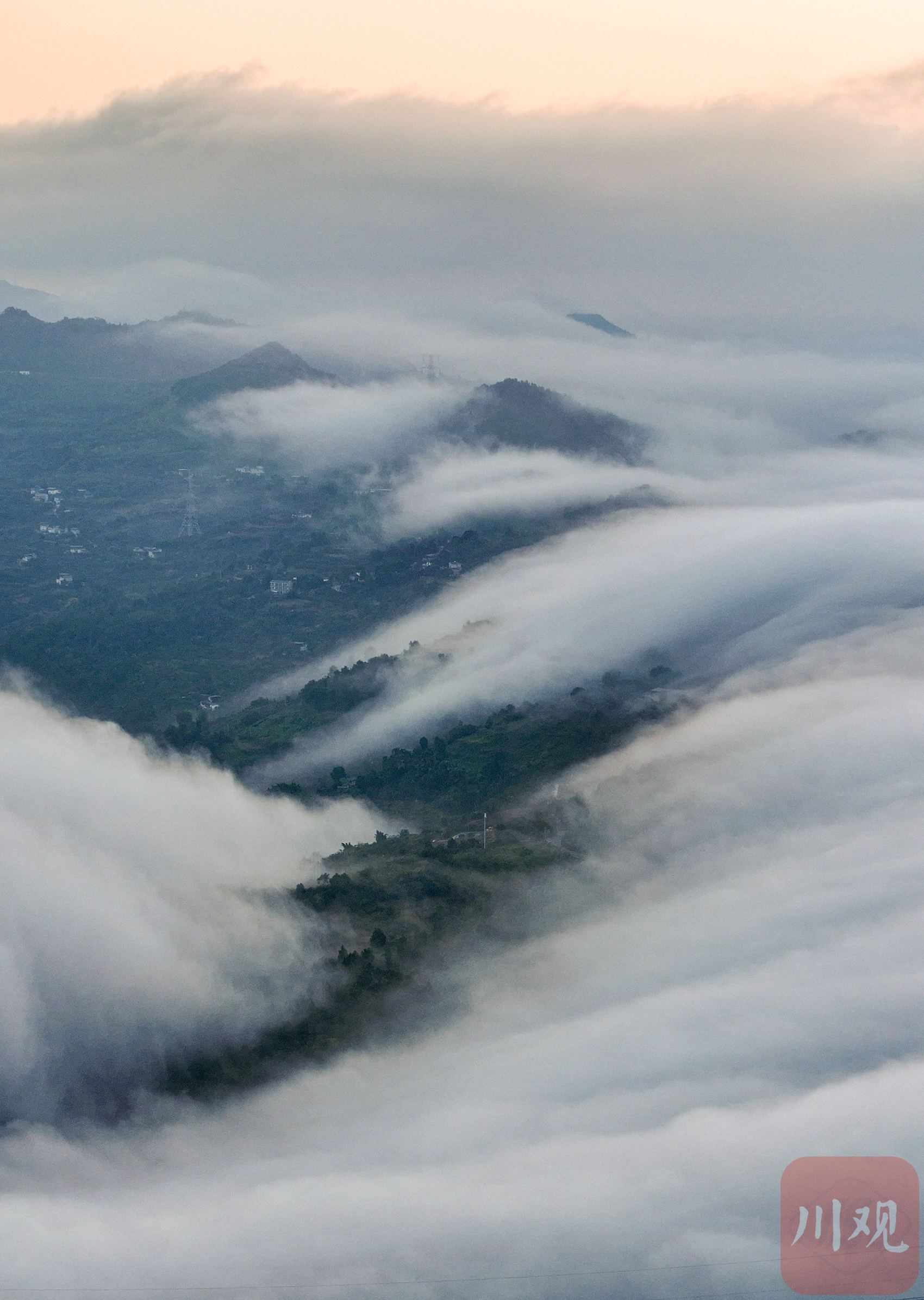 云瀑如白練傾瀉,在黛色山巒與城市樓宇間肆意鋪展,像大自然揮毫潑墨,把成都的清晨暈染成了夢幻山水長卷。