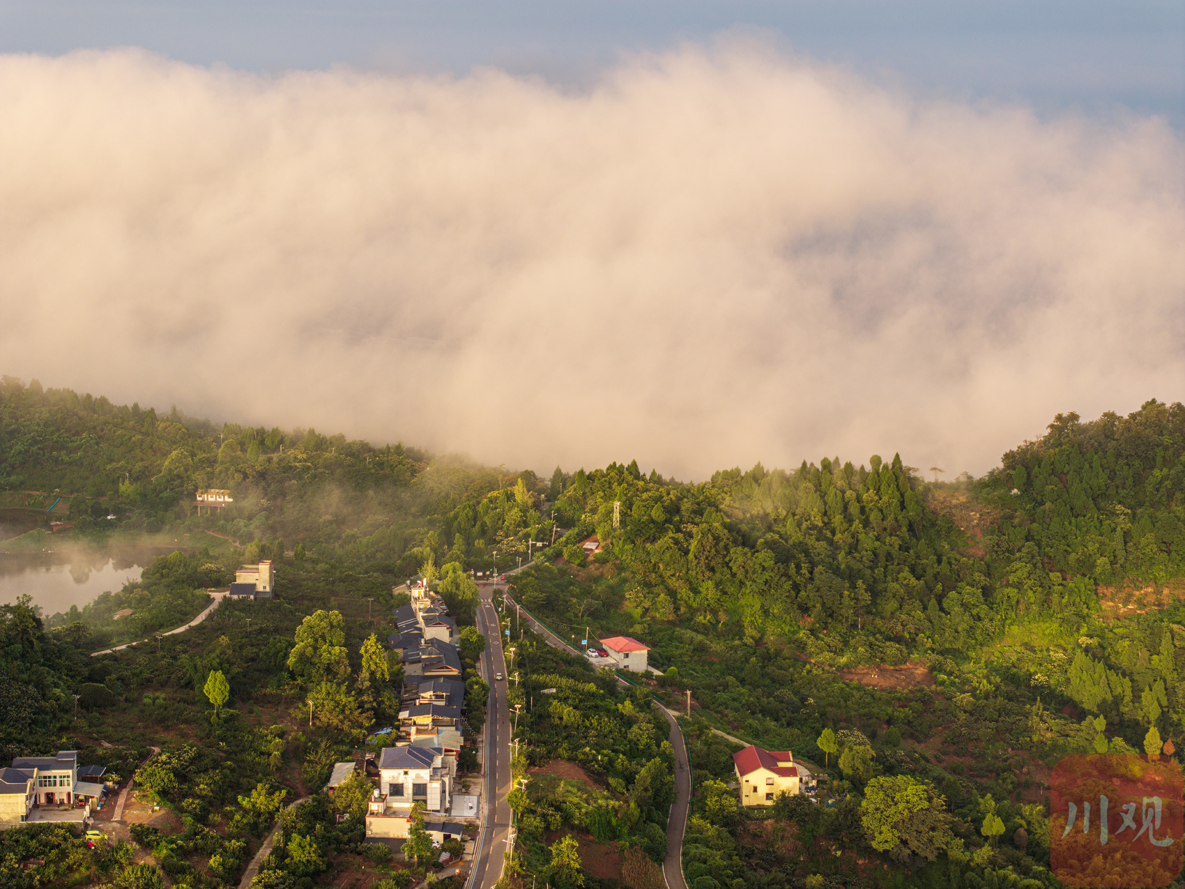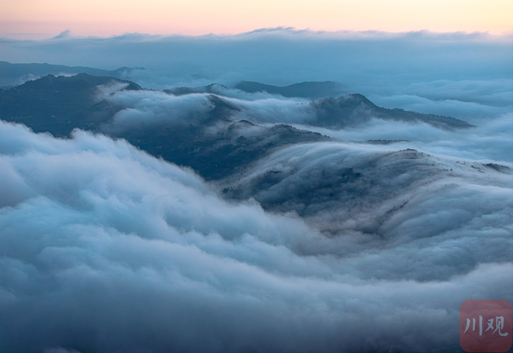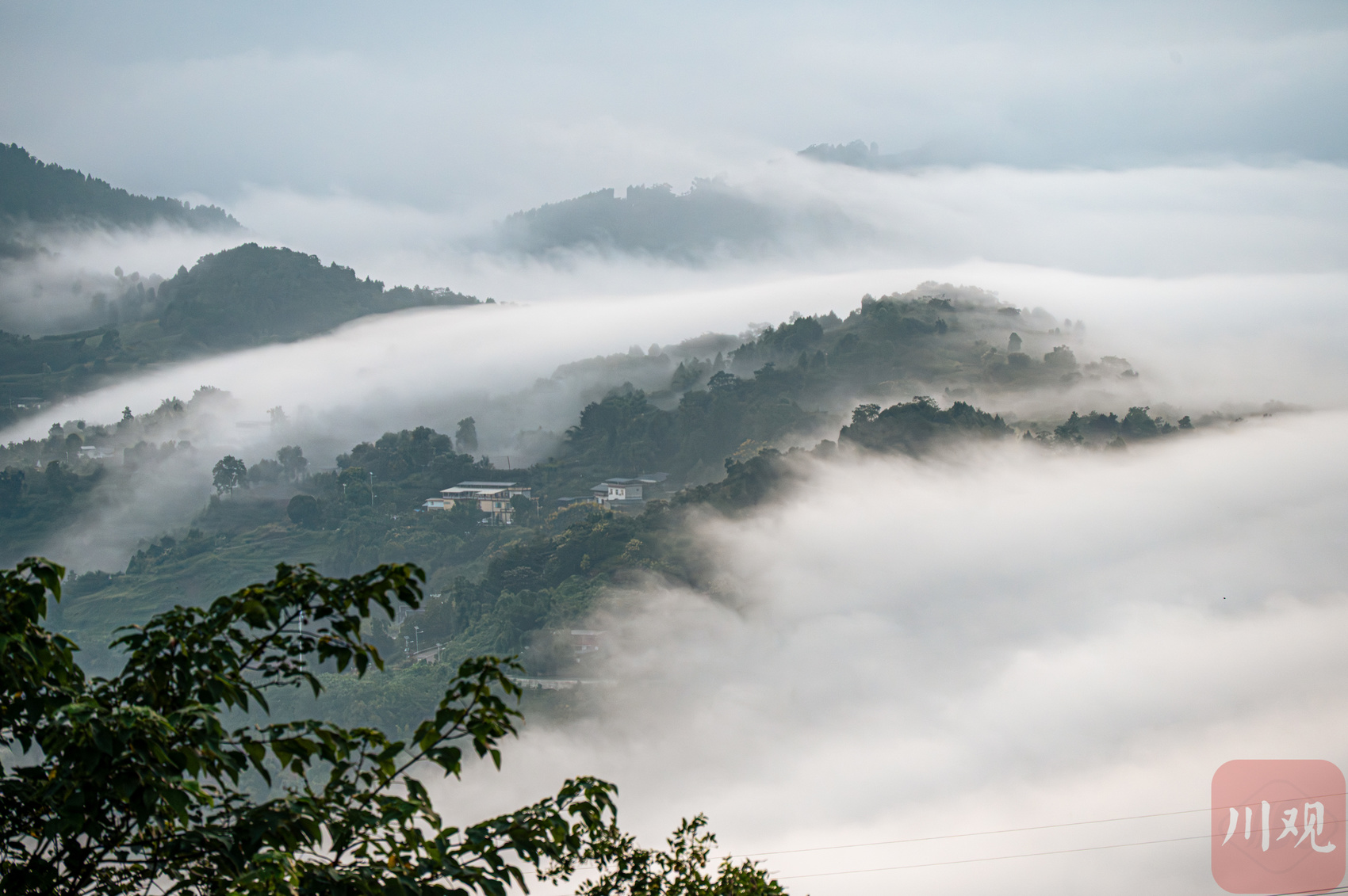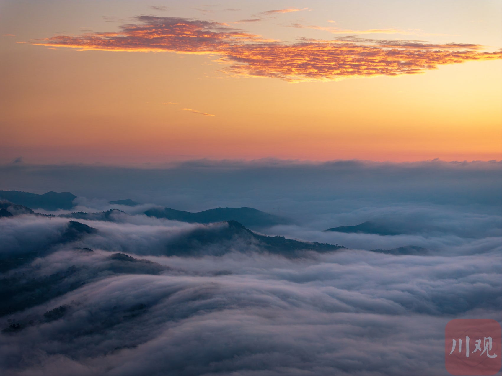 云瀑如白練傾瀉,在黛色山巒與城市樓宇間肆意鋪展,像大自然揮毫潑墨,把成都的清晨暈染成了夢幻山水長卷。