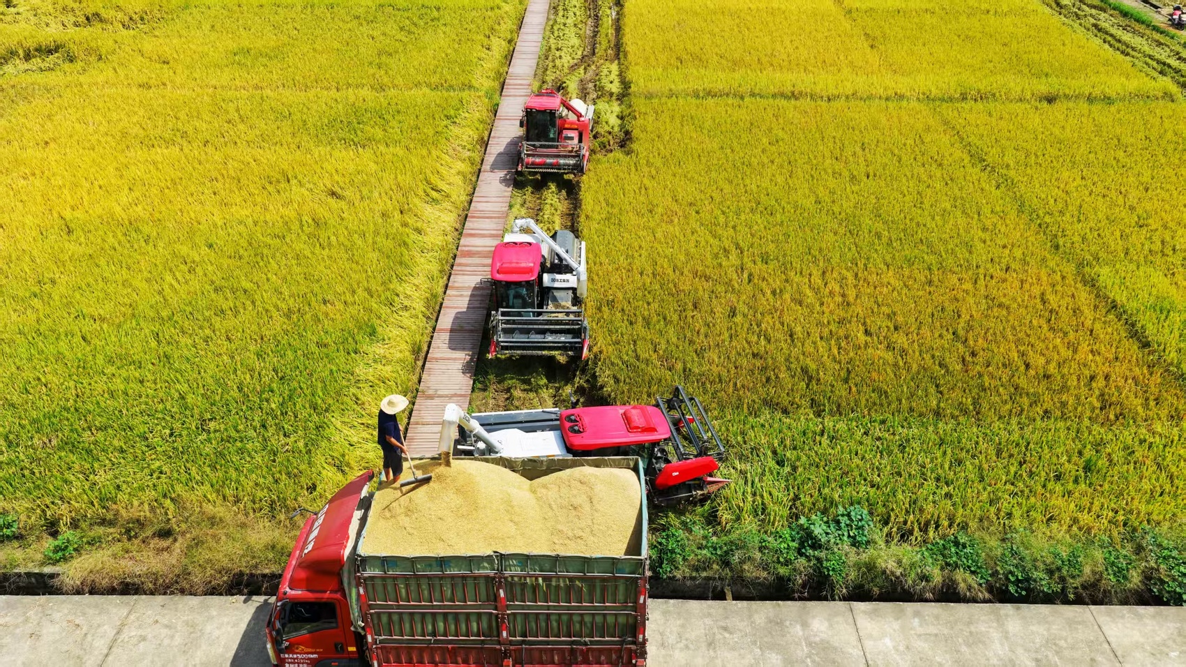 9月14日下午,在位于崇州市的天府糧倉國家現代農業產業園長江上游優質糧油中試熟化基地,5臺收割機在田間來回穿梭,切割、脫粒、裝車……全程機械化作業。不到3個小時,100余畝水稻顆粒歸倉。