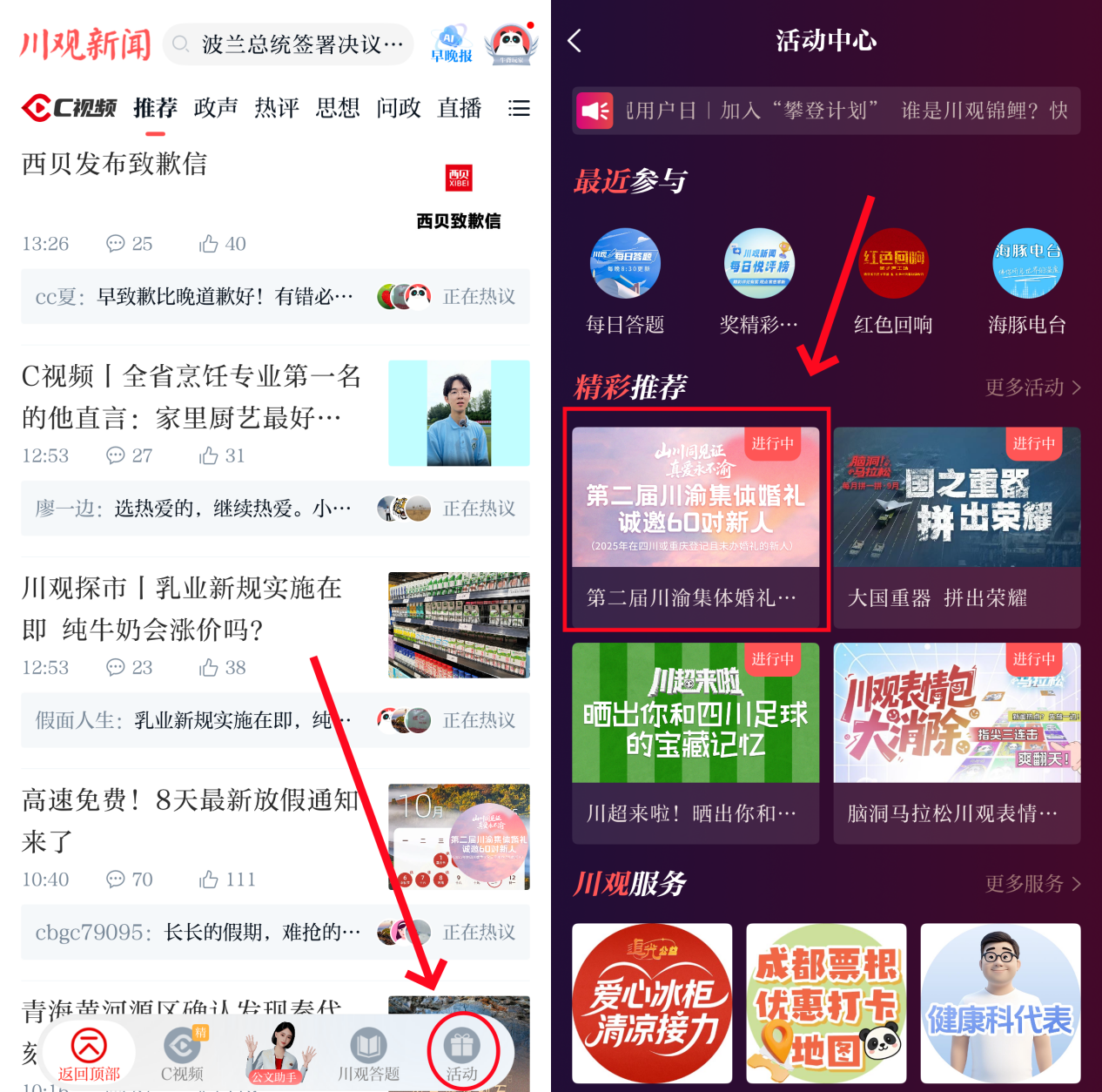 方式二:在川觀新聞首頁,點擊右下角“活動”,進入到“活動中心”,找到“第二屆川渝集體婚禮征集令”活動圖片點擊參與。