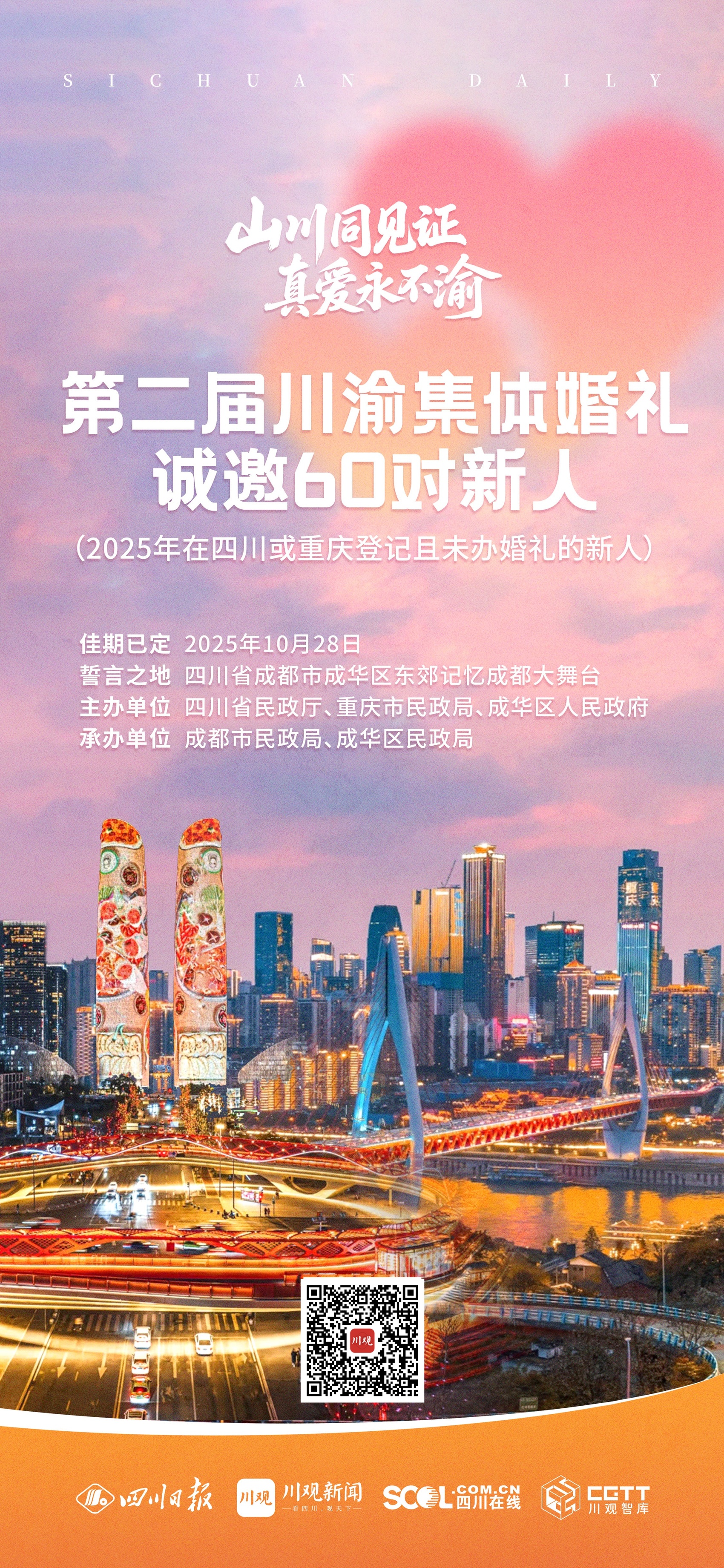 主辦方誠邀60對2025年在四川或重慶登記且未辦婚禮的新人參加,讓川渝故事,書寫你們的婚典新篇,期待與您,共赴這場跨越山水的浪漫之約。