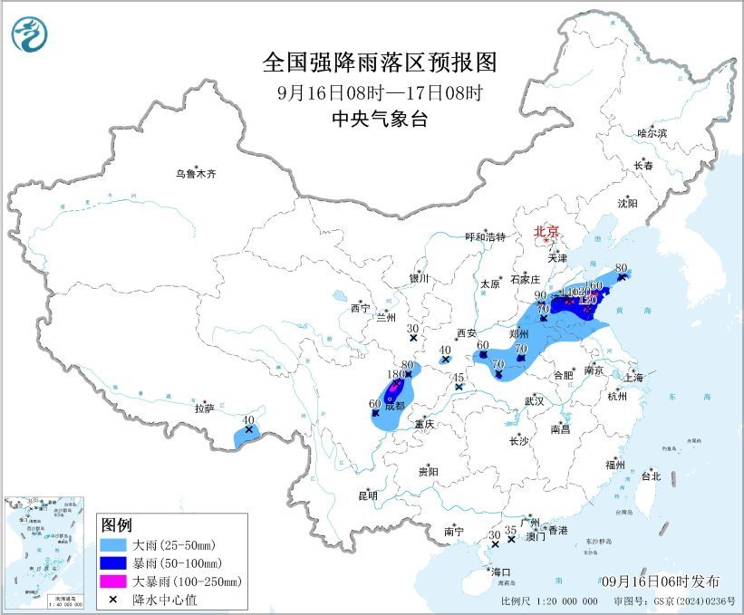 ?中央氣象臺今日(9月16日)6時發(fā)布暴雨黃色預(yù)警:預(yù)計,9月16日8時至17日8時,四川盆地中西部、甘肅南部、河南中東部、山東中南部以及蘇皖北部等地部分地區(qū)有大到暴雨,其中,山東中南部、四川盆地北部等地部分地區(qū)有大暴雨。15日,中國氣象局啟動重大氣象災(zāi)害(暴雨)Ⅳ級應(yīng)急響應(yīng)。