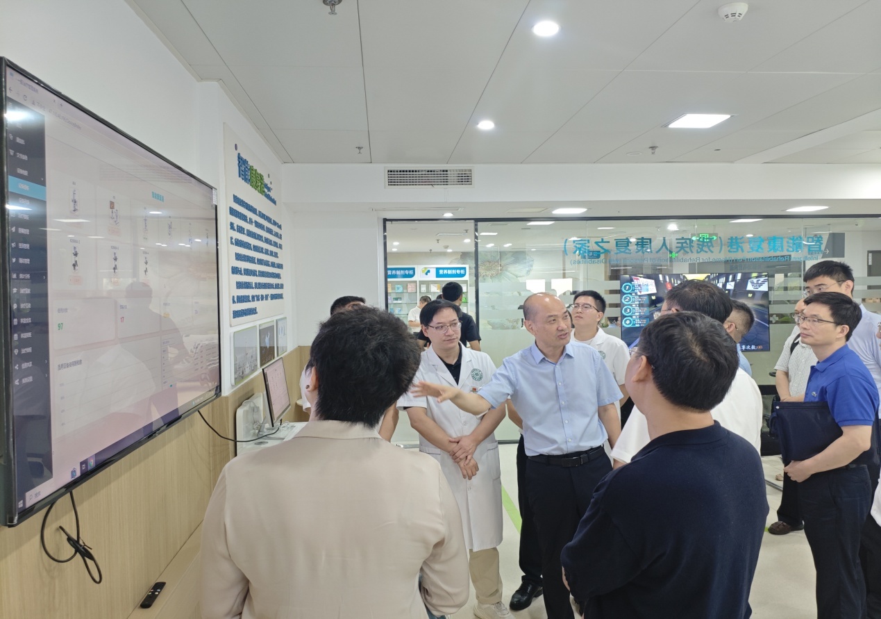 在中心智能康復港,胡向陽副理事長實地觀摩了康復治療的全流程,重點了解智能技術在偏癱患者康復訓練中的應用?,F場,一名偏癱患者正在康復治療師的指導下,借助機器人輔助康復設備進行步態重建訓練。通過設備的智能感知與助力功能,患者可逐步恢復下肢運動功能,改善步態穩定性,訓練數據還能實時同步至系統,為治療師調整康復方案提供數據支持。