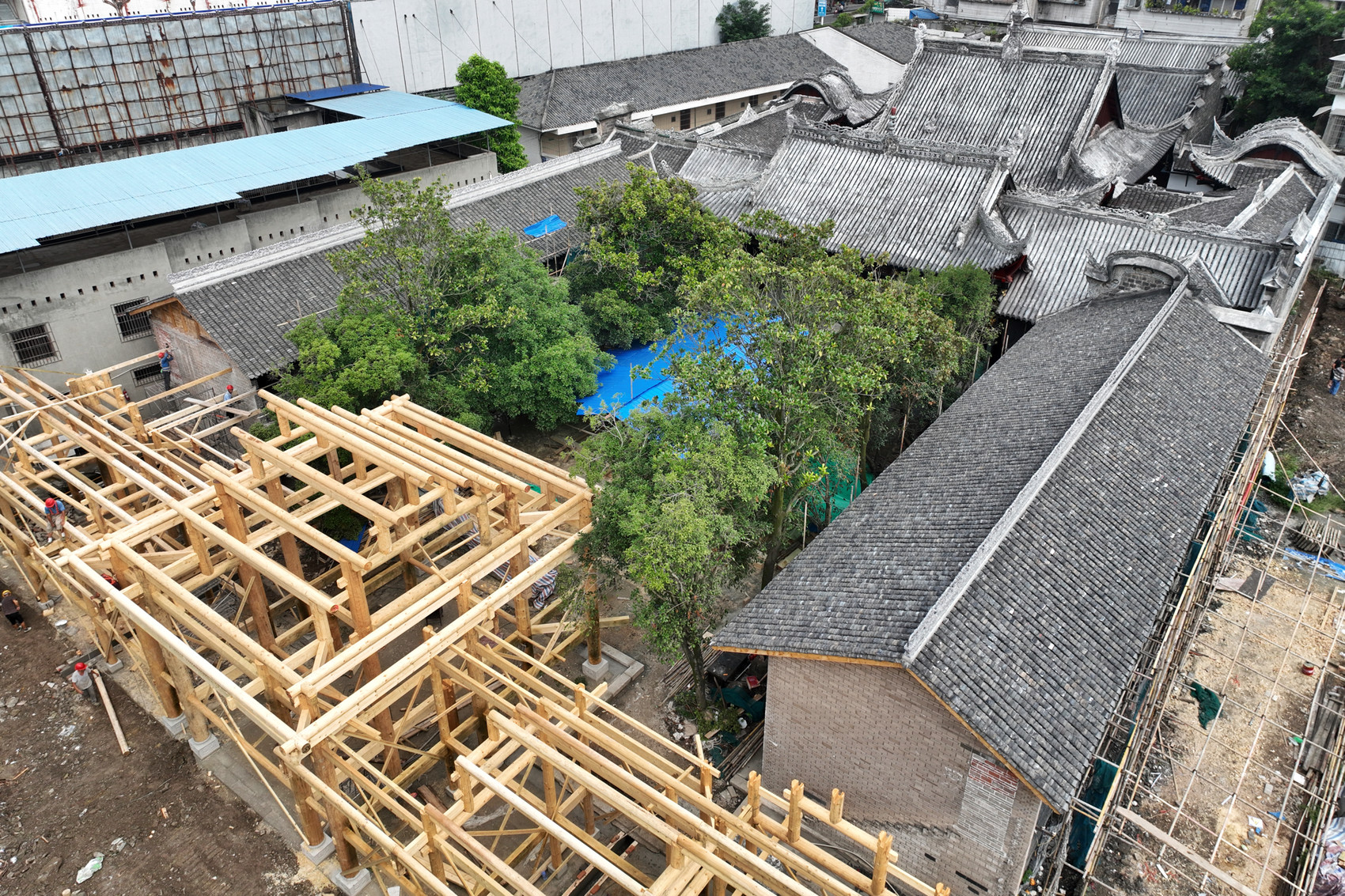 9月16日,內江市資中縣重龍鎮南華宮修繕現場一片繁忙,工匠師傅們各自把細地完成著各項修繕搭建工作。