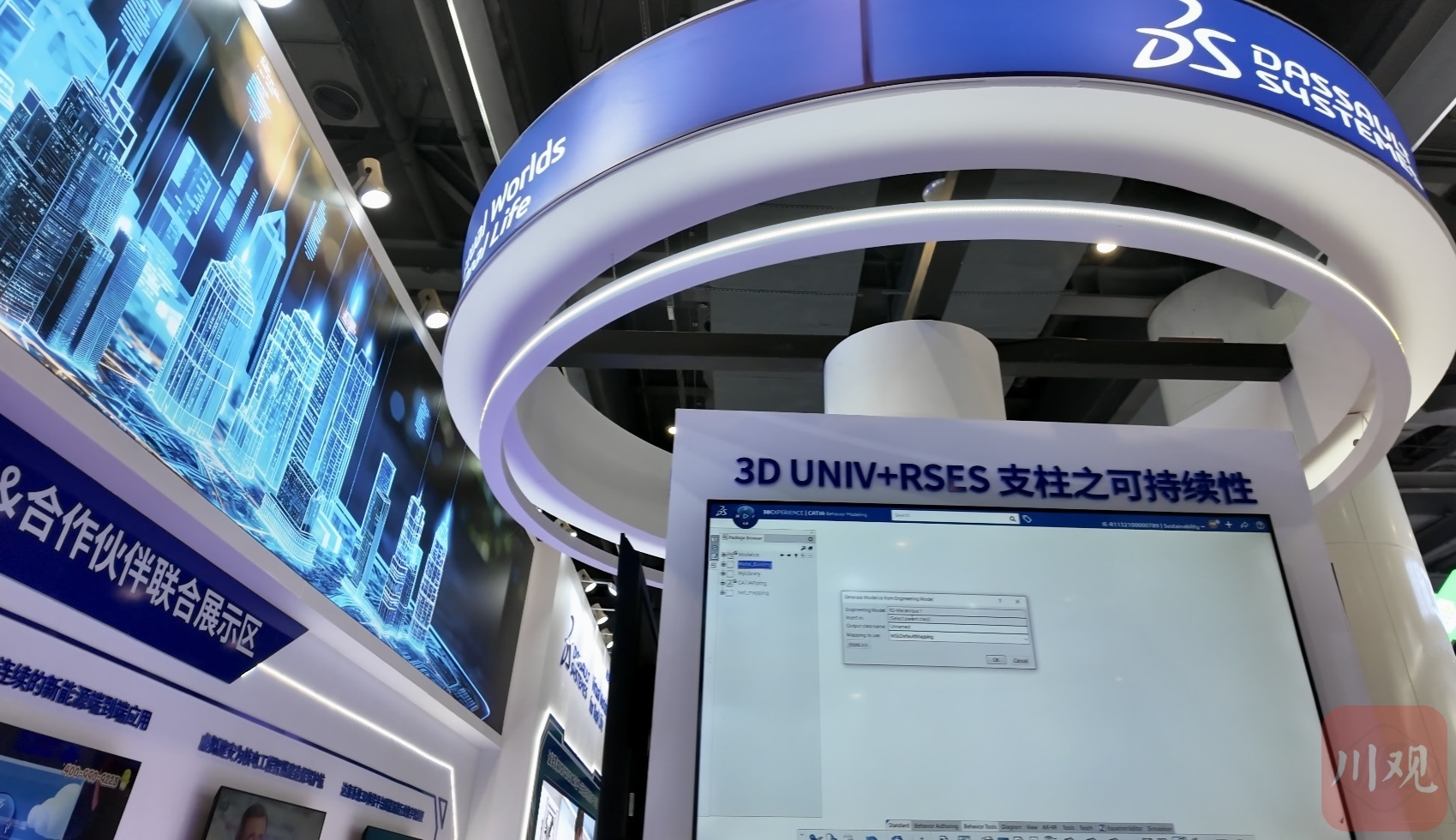 在法國達索系統展區,這里不見任何實體設備,取而代之的是一整面墻的LED屏幕,正循環播放各大企業智能工廠的運行視頻與三維可視化方案。