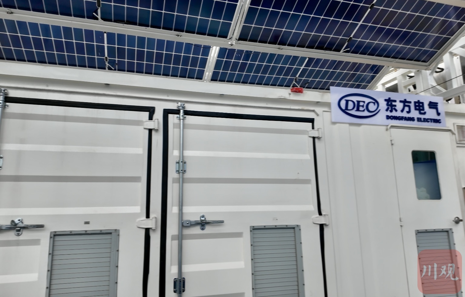 在主場館外,一臺占地30平方米,形似集裝箱的設備屹立在門口,設備外側,形似遮陽雨棚的支架上頂著數十片可移動的光伏板,從遠處看像一個露營基地。