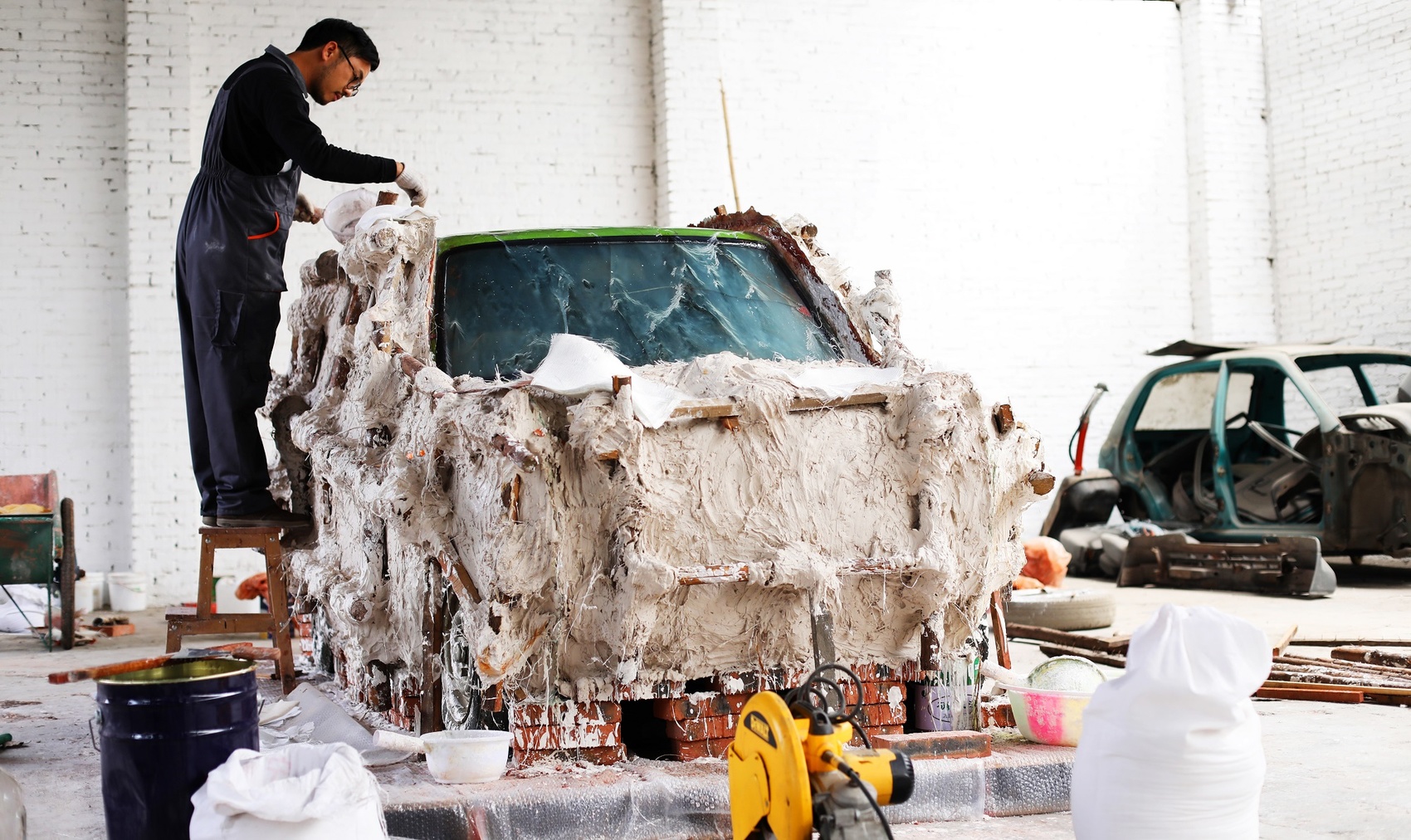 《脫胎漆車計劃》創作歷時三年,曾楊帶著學生,用傳統工藝制作了1:1大小的車身,以及上百個汽車零部件。“大體量意味著結構不穩定。”由于沒有胎體,缺乏支撐,漆車很容易垮掉,“材料配比如何調整,工藝步驟誰先誰后,我們在創作過程中反復試驗。”最后,他們終于找到了既嚴格遵循傳統漆藝,又符合自身美學表達的工藝,最終讓作品“立起來”。