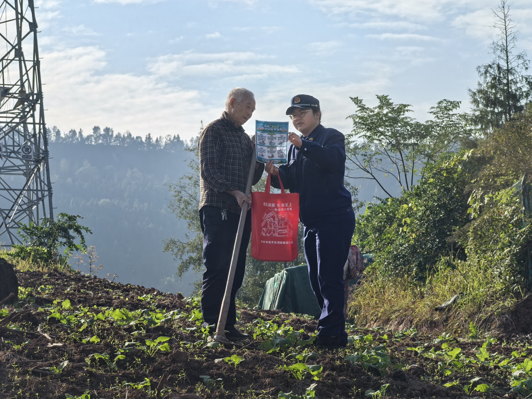巴中市消防員到轄區農村開展防消聯勤,向老人宣傳消防知識。