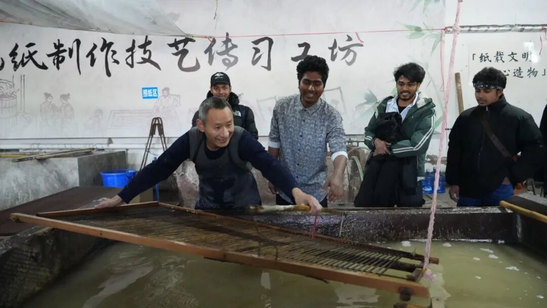 在大千紙故里研學基地,講解員用生動的語言講述著手工造紙的72道工序,帶領他們探索手工造紙的秘密,深入了解夾江竹紙制作技藝的千年發(fā)展歷程。同學們通過體驗選料、蒸煮、抄紙等工序,觸摸跨越千年的文化脈絡。