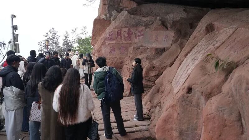 東風堰——千佛巖景區(qū)是本次活動的首站,來自孟加拉國、老撾、柬埔寨、印度尼西亞、塔吉克斯坦、吉爾吉斯斯坦等國家的國際新生聽著講解員娓娓道來關于景區(qū)的傳奇故事,穿過聚賢街的那刻,他們仿佛進入“時間隧道”,探索古人修建世界灌溉工程遺產東風堰時的智慧,漫步古涇口厚重的石階上,感受歷史的足跡,觀江水中忽隱忽現的望龍坪、看巍峨聳立的摩崖題壁與經典佛龕,體會歷史的厚重與寧靜。