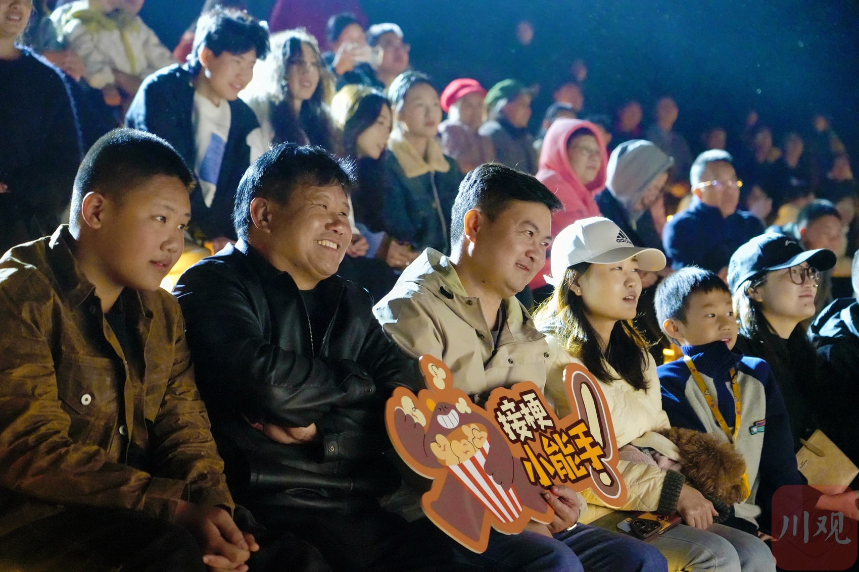 于是,聚光燈亮起。緊靠著田埂,一個臨時的小舞臺搭建起來,異木棉樹上,掛滿暖黃色的小燈。小板凳、竹椅圍成半圓,坐滿了人:拿著玩具的孩子竊語著,拄著拐杖的老人傾聽著,中年漢子褲腳還沾著泥,幾個年輕人舉著手機錄像,屏幕的光映亮了他們笑彎的眼睛。