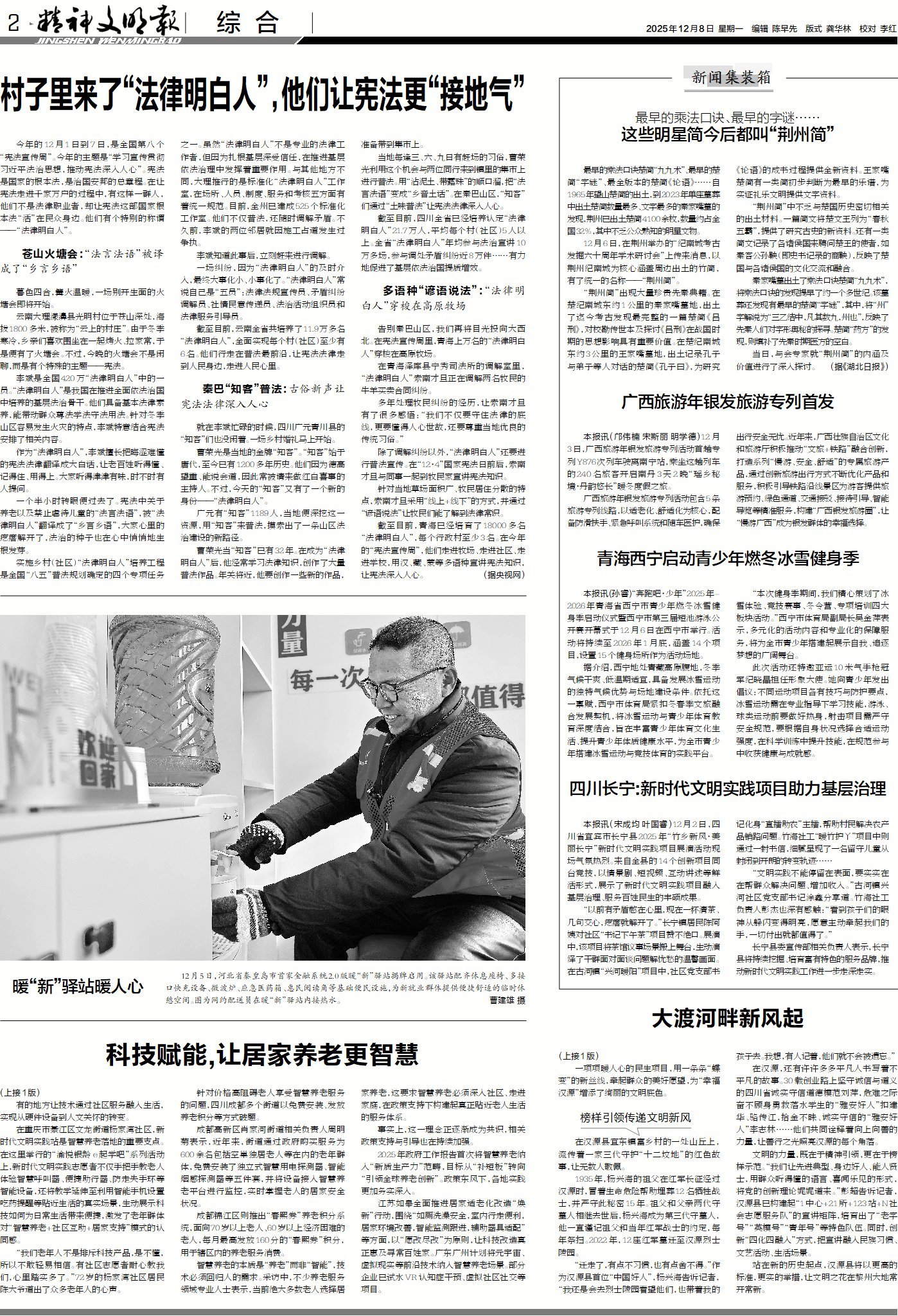 今日版面“早”知道:1版《一線調查》欄目聚焦居家養老智慧化的現狀、難點和破題之法;《熱點觀察》欄目關注“全網最忙五人組”名單造假事件背后的問題;2版頭條帶你一起認識村子里的“法律明白人”,看他們如何讓憲法更接地氣;3版《文明棱鏡》探討“吸毒記錄封存”爭議背后的法治平衡。
