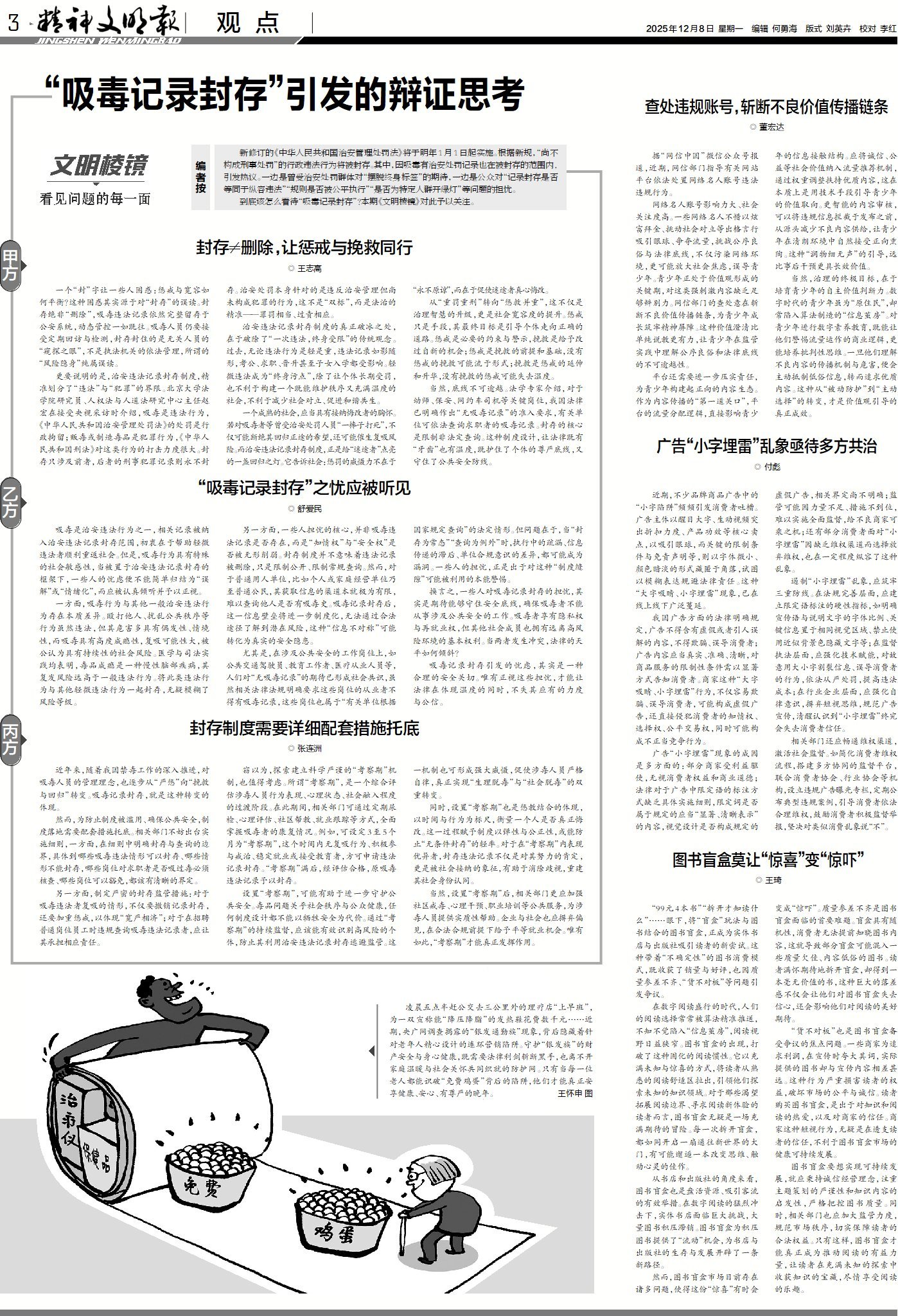 新修訂的《中華人民共和國治安管理處罰法》明年1月1日實施,其中規定“尚不構成刑事處罰”的行政違法行為記錄將被封存,包括吸毒治安處罰記錄,引發熱議。一方面,吸毒受罰群體期待“擺脫終身標簽”;另一方面,公眾擔憂“吸毒記錄封存是否縱容違法”“規則執行是否公平”。該如何看待“吸毒記錄封存”?請看今日3版《文明棱鏡》的討論。