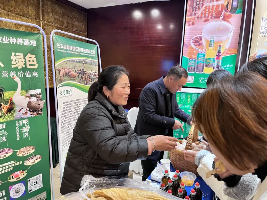 長豐縣陶樓鎮沃野養殖家庭農場的何榮秀在向團長們推介產品。