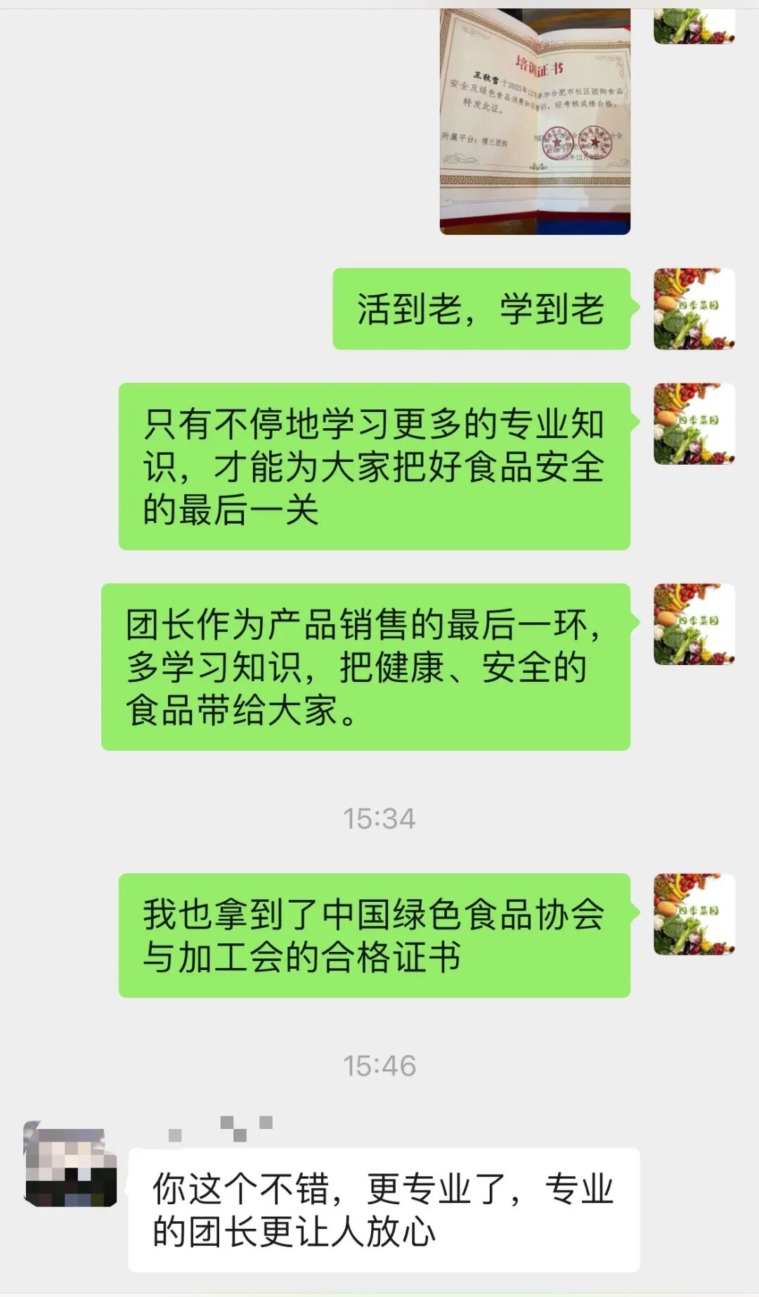 “90后”團長王秋雪做社區團購三年,日常工作是在送孩子上學后,瀏覽團購平臺選品,憑著自己的品嘗體驗和其他團長的建議,把肉蛋奶、果蔬、零食等品類推薦給群友。“以往主要是分享品相、味道和價格等方面的信息。”參加培訓后,王秋雪意識到需要更深入了解產品,比如蔬菜的農殘情況、配料表的成分、生產標準的識別等。“每一個細節都關乎食品安全。作為經過培訓的團長,應該有足夠能力辨別產品優劣。”