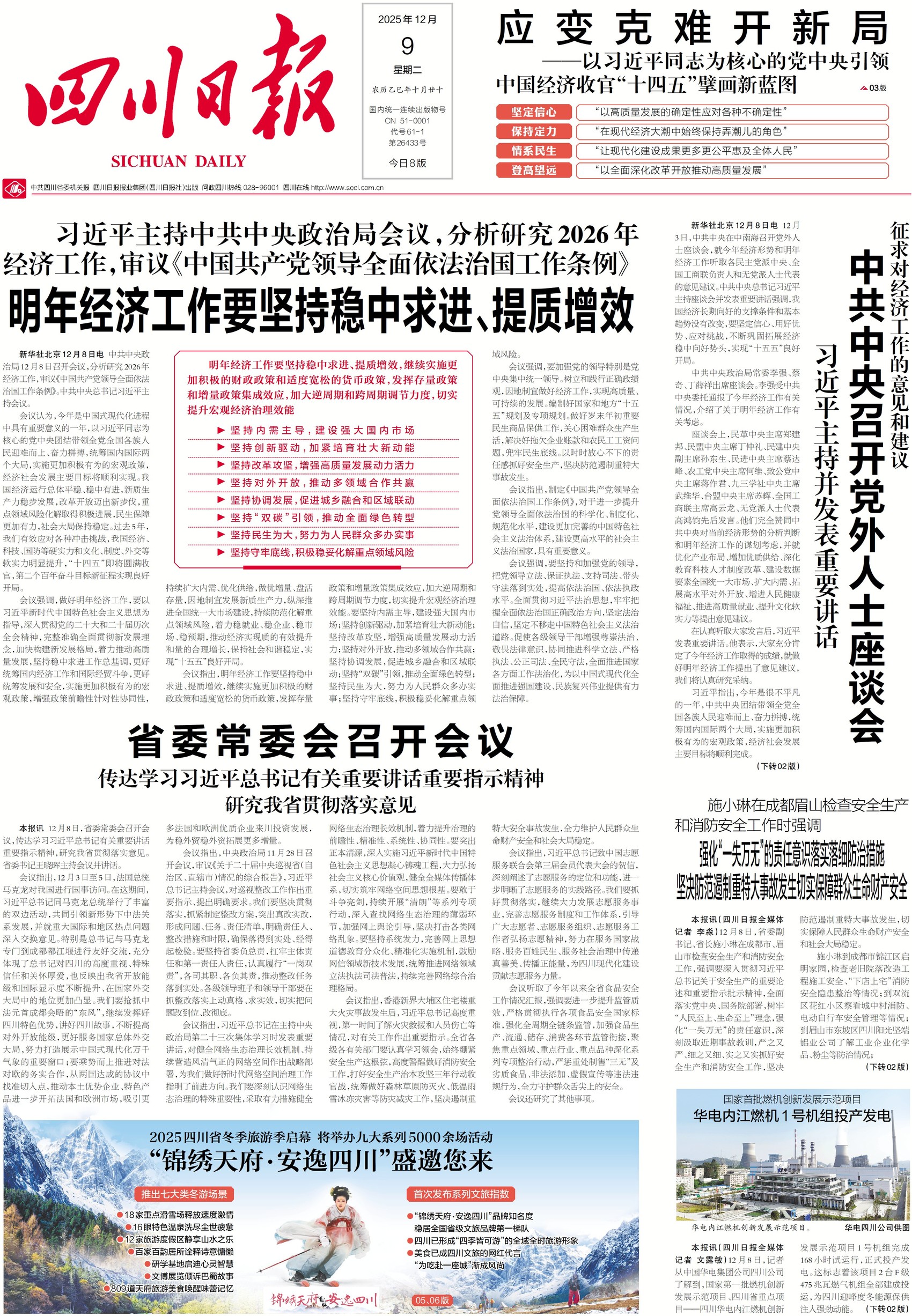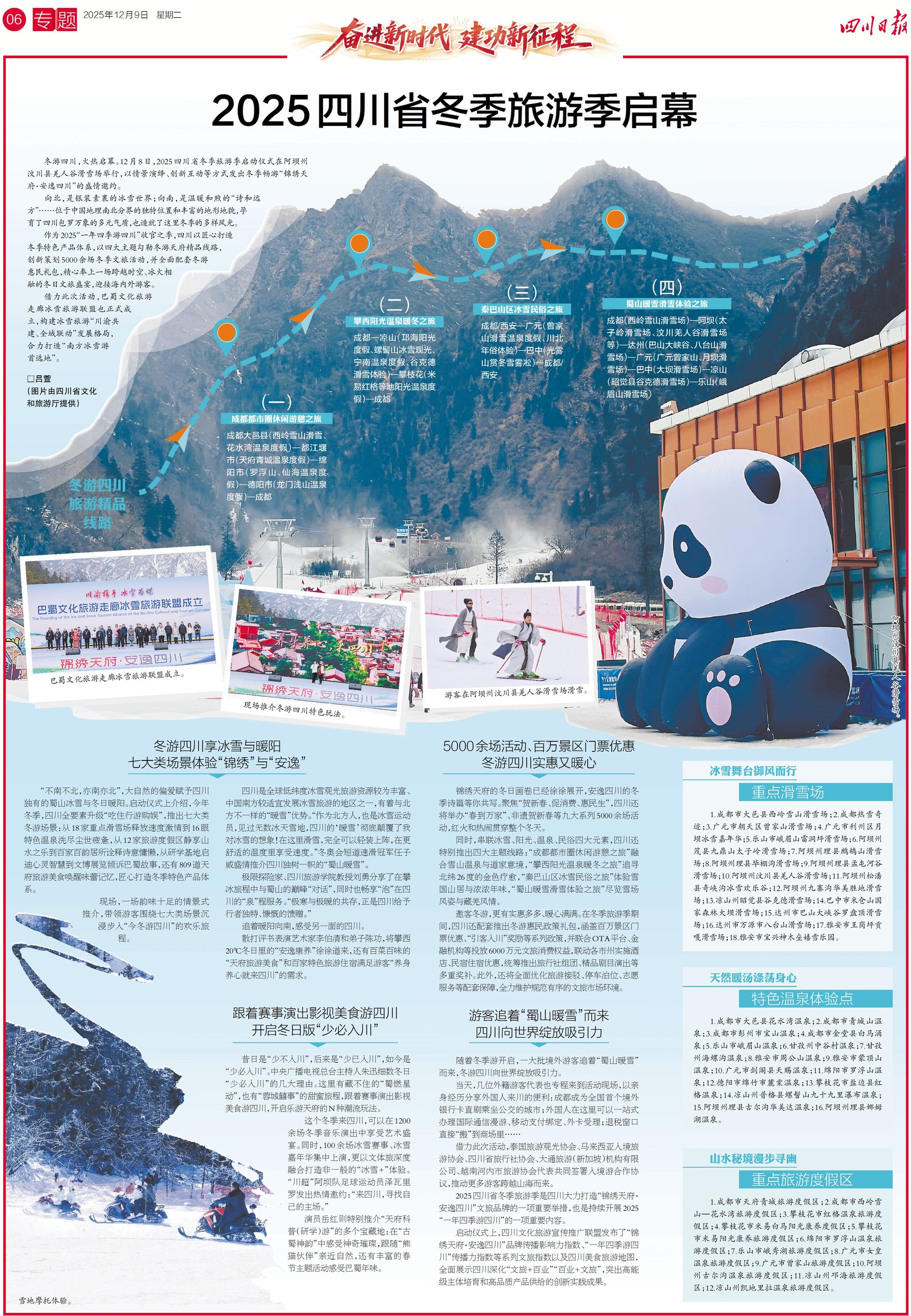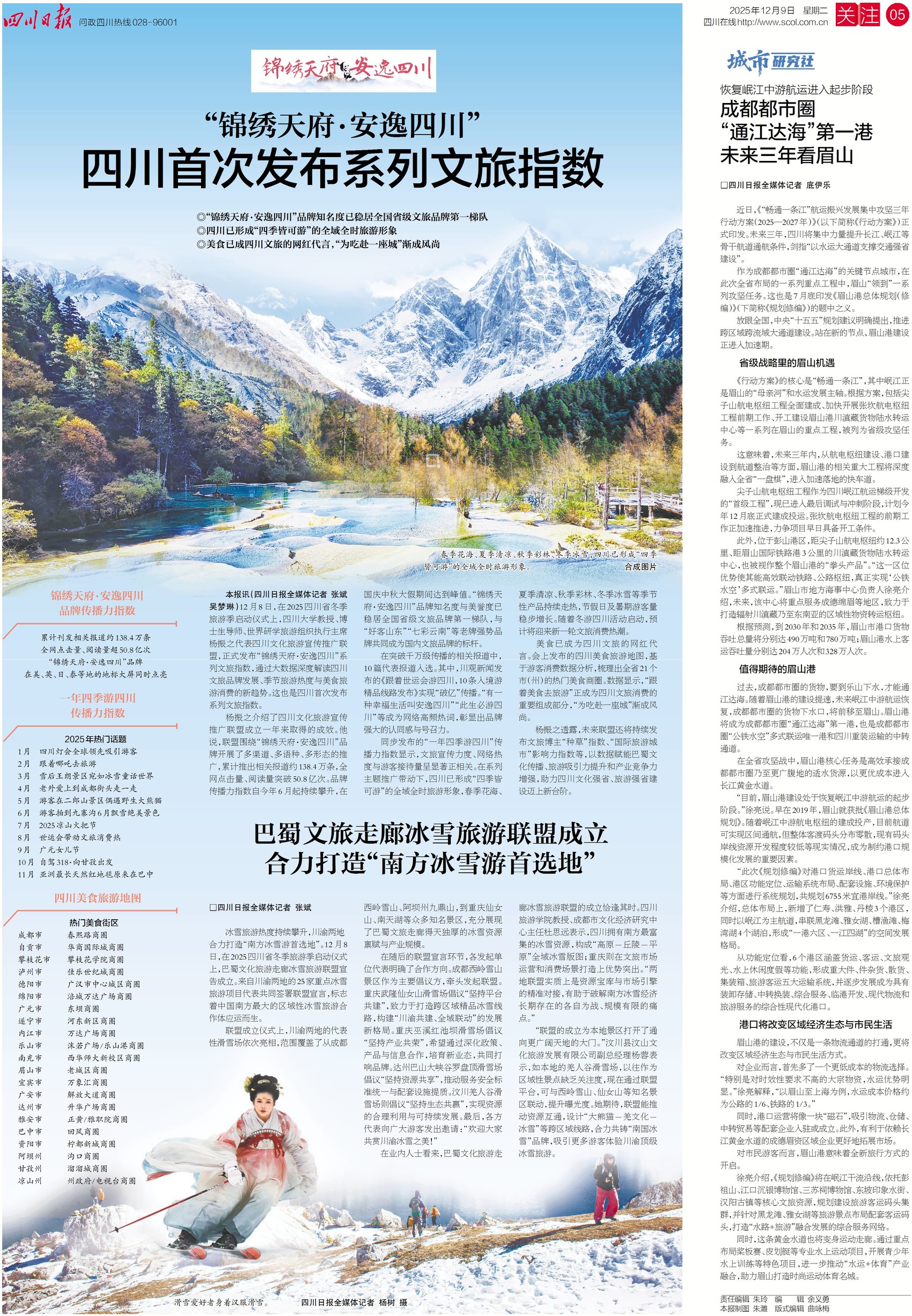 12月8日,2025四川省冬季旅游季啟幕,將舉辦九大系列5000余場活動。啟動儀式上,四川文化旅游宣傳推廣聯盟首次發布“錦繡天府?安逸四川”系列文旅指數。聯盟成立一年來,圍繞“錦繡天府·安逸四川”品牌推廣報道超138萬條、全網閱讀量破50億次,品牌穩居全國省級文旅第一梯隊。關注5版6版,看你想去哪玩。