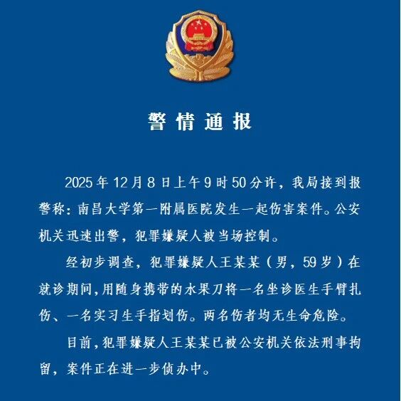 2025年12月8日上午9時50分許,我局接到報警稱:南昌大學第一附屬醫院發生一起傷害案件。公安機關迅速出警,犯罪嫌疑人被當場控制。