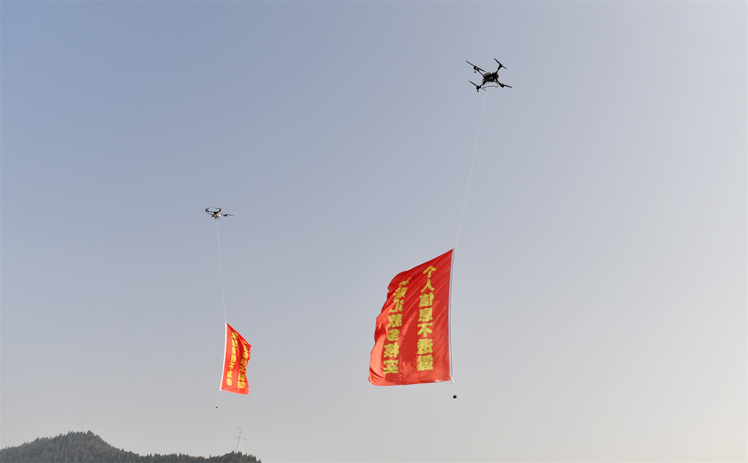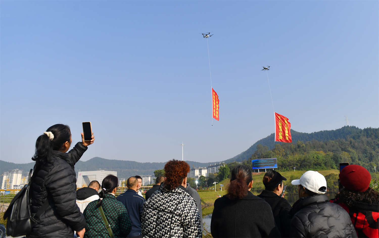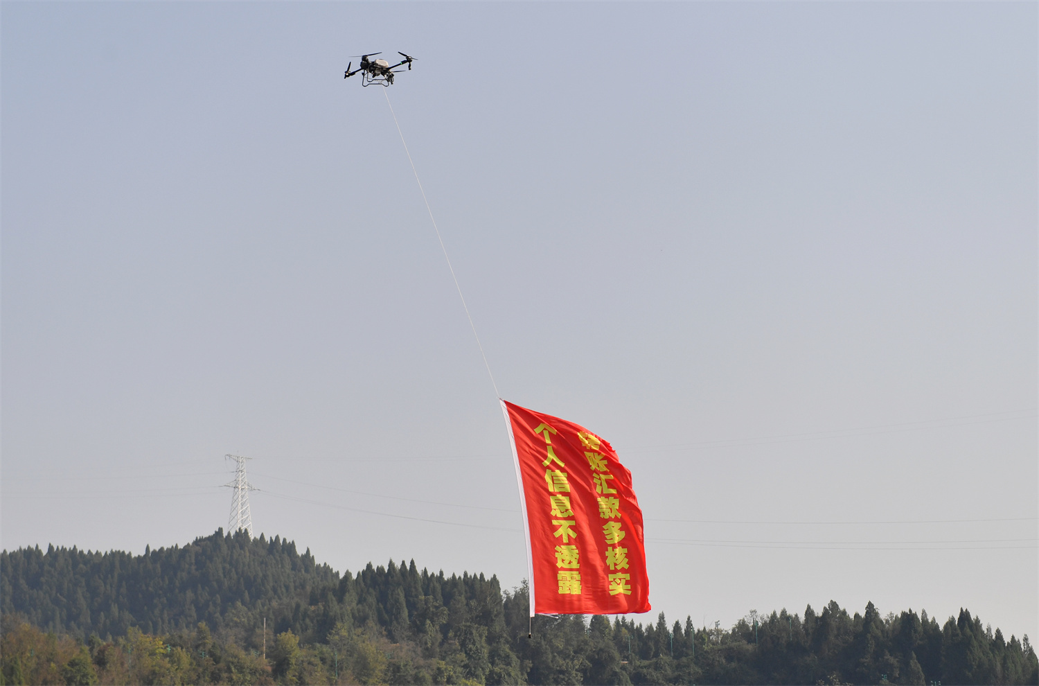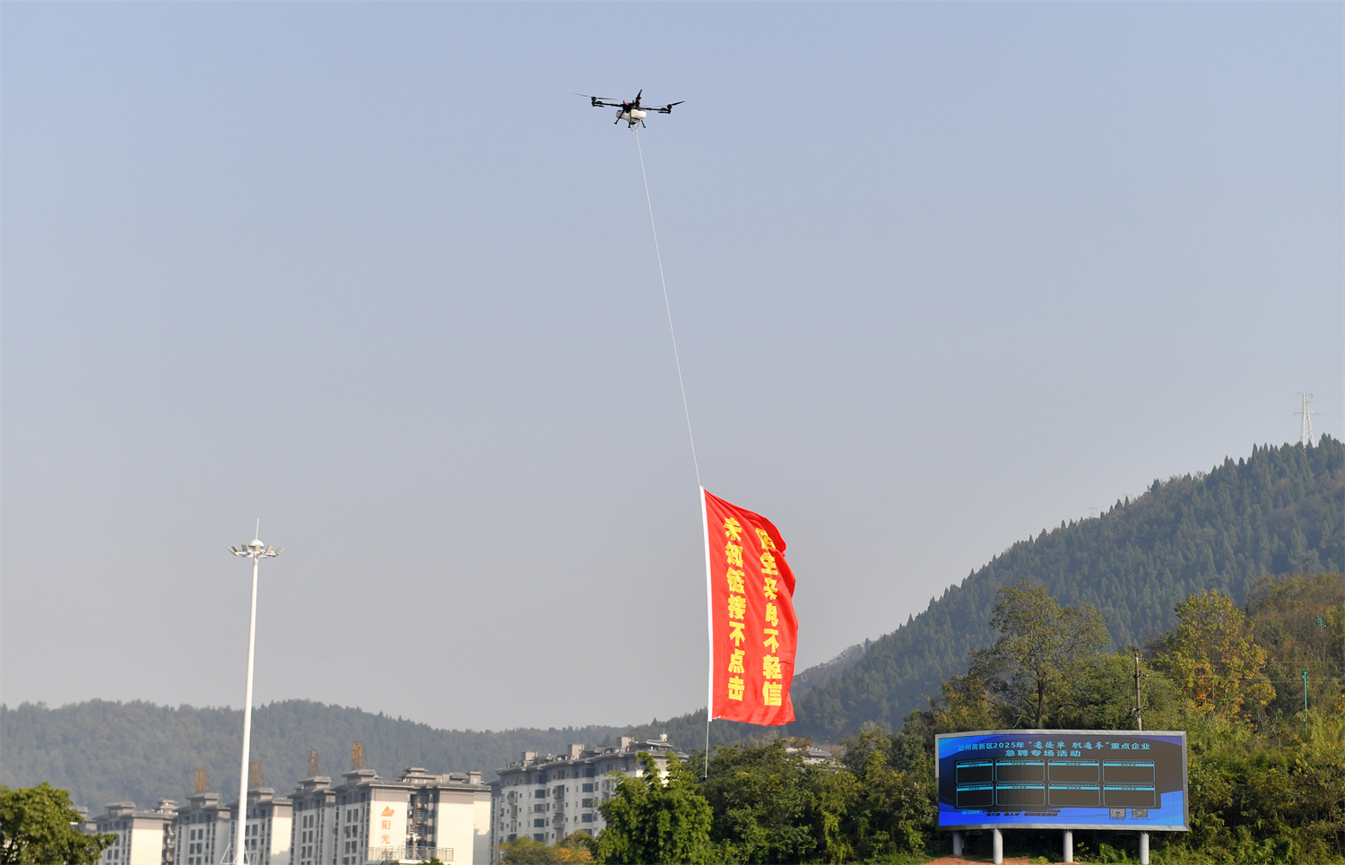 “個人信息不透露 轉賬匯款多核實”“未知鏈接不點擊 陌生來電不輕信”,近日,在達州市梨樹坪濕地公園上空,兩架大型無人機懸掛著印有反詐宣傳標語的條幅在空中盤旋,宣傳著防騙反詐知識。