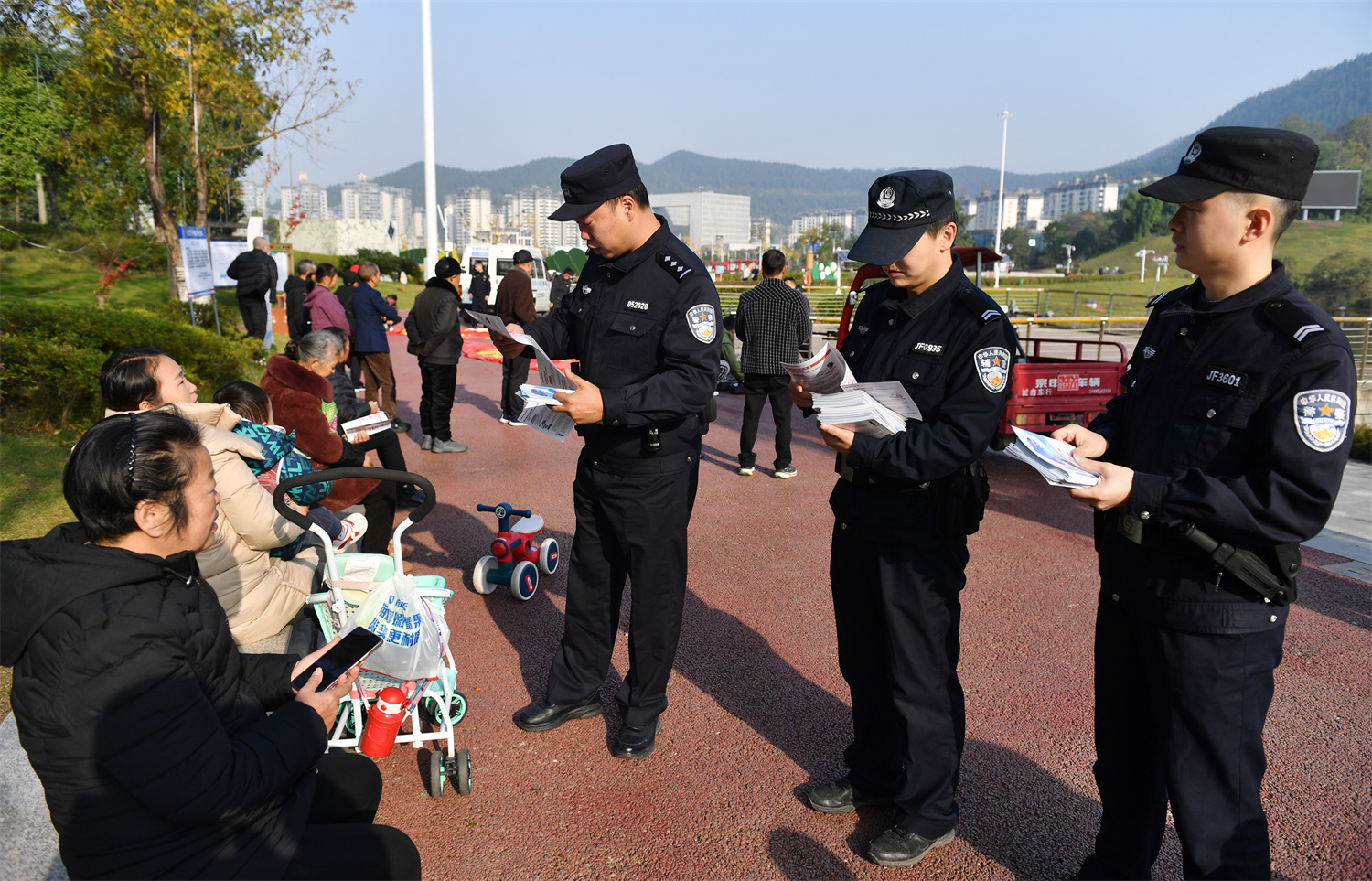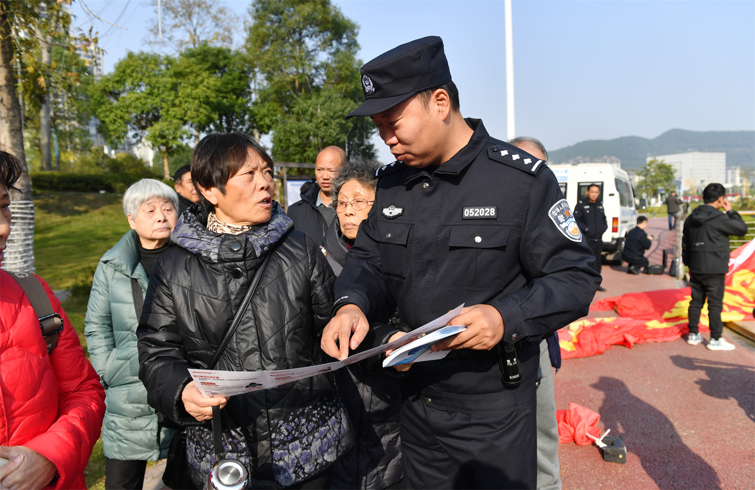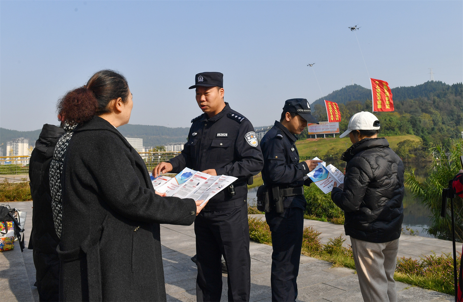 在無人機下方,民輔警在人群中同步開展反詐宣傳,他們在發放反詐宣傳單的同時,結合近期高發的電信詐騙案例,提醒大家如何識別詐騙陷阱、保護個人財產安全。