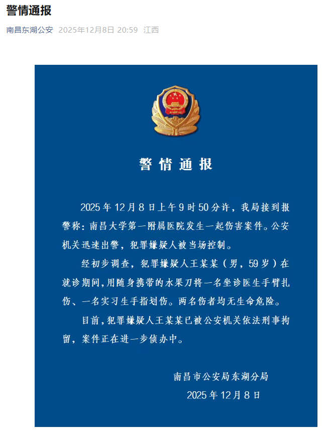 2025年12月8日上午9時50分許,該局接到報警稱:南昌大學第一附屬醫院發生一起傷害案件。公安機關迅速出警,犯罪嫌疑人被當場控制。