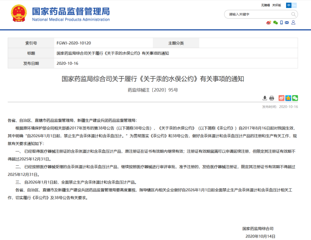 根據原環境保護部會同相關部委2017年發布的第38號公告(以下簡稱38號公告),《關于汞的水俁公約》(以下簡稱《汞公約》)自2017年8月16日起對我國生效,其中明確“自2026年1月1日起,禁止生產含汞體溫計和含汞血壓計。”為貫徹落實《汞公約》和38號公告,做好含汞體溫計和含汞血壓計產品的注冊和生產有關工作,現就有關要求通知如下:
