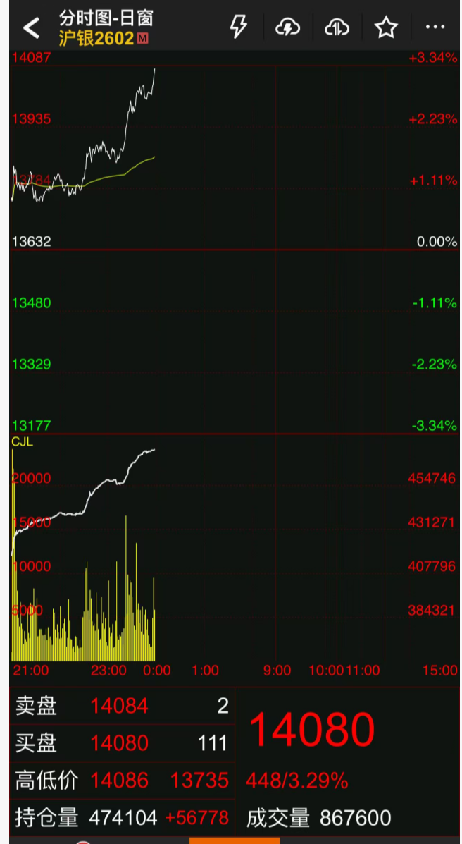 12月9日晚間,黃金小幅走高,白銀則攀升至歷史新高。現貨白銀首次站上60美元/盎司的心理關口,紐約期銀也首次站上60美元/盎司,滬銀主力合約現漲幅超過3%,最高漲至14086元/千克,續創歷史新高。