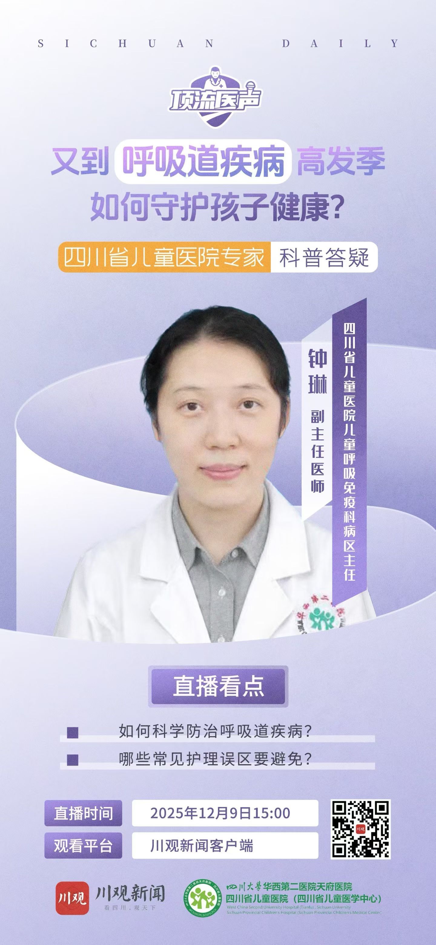 冬季是兒童呼吸道疾病的高發季,不少孩子出現反復發燒、劇烈咳嗽等癥狀,家長憂心不已。12月9日,四川省兒童醫院兒童呼吸免疫科病區主任鐘琳做客川觀新聞“頂流醫生”直播間,拆解兒童呼吸道疾病的識別、防治與護理要點。
