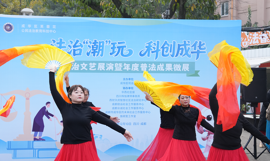 12月10日上午,成都市成華區芙蓉花公民法治教育科創中心內歡聲笑語、舞姿翩躚,一場以“法治‘潮’玩 科創成華”為主題的法治文藝展演暨年度普法成果微展活動在此舉行。活動發布了成華區司法局創新打造的“法治芙蓉云種樹”交互系統,集中展示成華年度普法成果,并通過精彩的法治文藝演出,讓市民感受法治的力量與溫度。