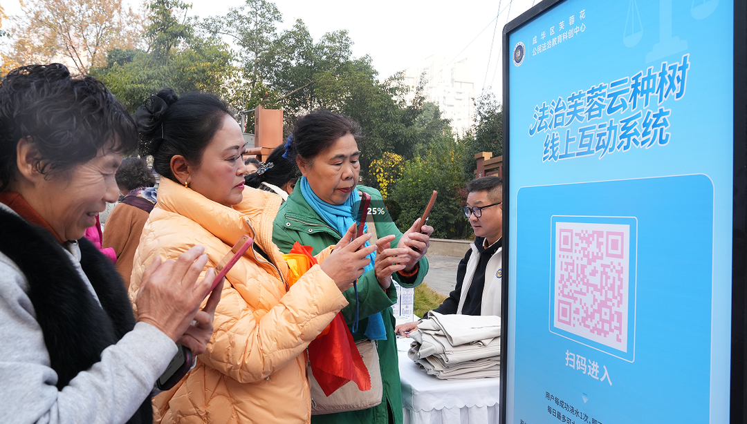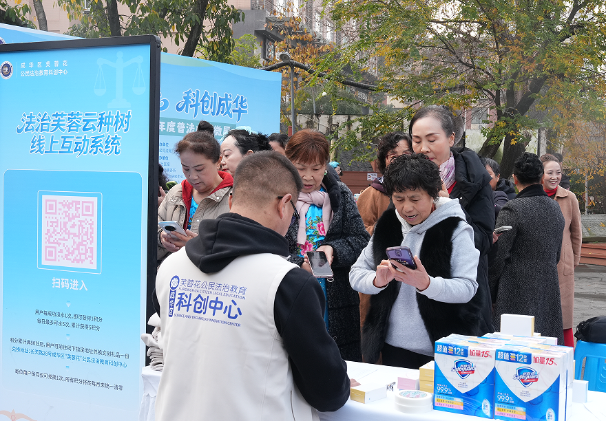 活動現場,由成華區司法局創新打造的“法治芙蓉云種樹”交互系統正式亮相。該系統將普法學習設計成趣味盎然的互動游戲,用戶通過微信掃碼進入平臺,每日可為“法治之樹”澆水,每次澆水即可獲得積分并隨機學習一條實用法律知識。當積分累積至一定數額,便可在線下指定地點兌換文創禮品。