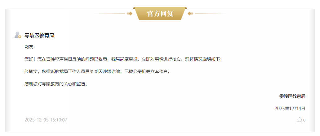 12月4日,永州市零陵區教育局對“投訴零陵區教育局工作人員收錢不辦事”回復表示,該局高度重視,立即對事情進行核實。經核實,網友投訴的該局工作人員呂某某因涉嫌詐騙,已被公安機關立案偵查。