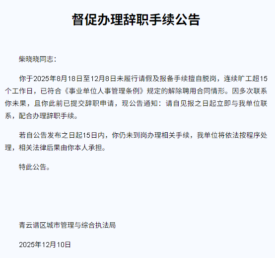 公告稱,柴曉曉同志于2025年8月18日至12月8日未履行請假及報備手續擅自脫崗,連續曠工超15個工作日,已符合《事業單位人事管理條例》規定的解除聘用合同情形。“因多次聯系你未果,且你此前已提交辭職申請,現公告通知:請自見報之日起立即與我單位聯系,配合辦理辭職手續。若自公告發布之日起15日內,你仍未到崗辦理相關手續,我單位將依法按程序處理,相關法律后果由你本人承擔。”