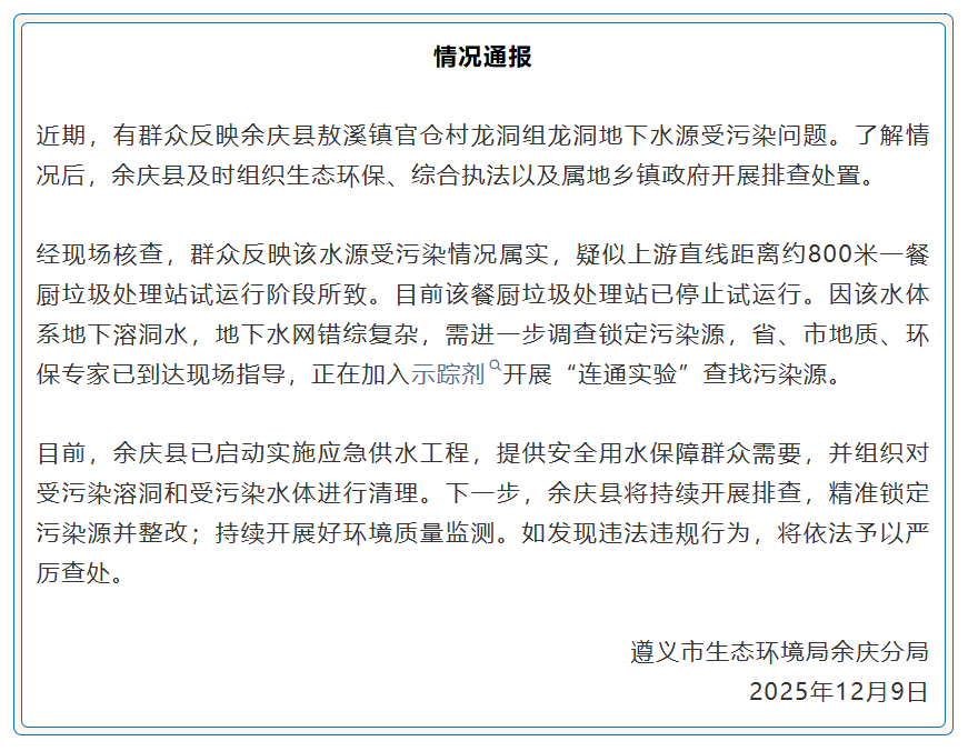 經現場核查,群眾反映該水源受污染情況屬實,疑似上游直線距離約800米一餐廚垃圾處理站試運行階段所致。目前該餐廚垃圾處理站已停止試運行。因該水體系地下溶洞水,地下水網錯綜復雜,需進一步調查鎖定污染源,省、市地質、環保專家已到達現場指導,正在加入示蹤劑開展“連通實驗”查找污染源。