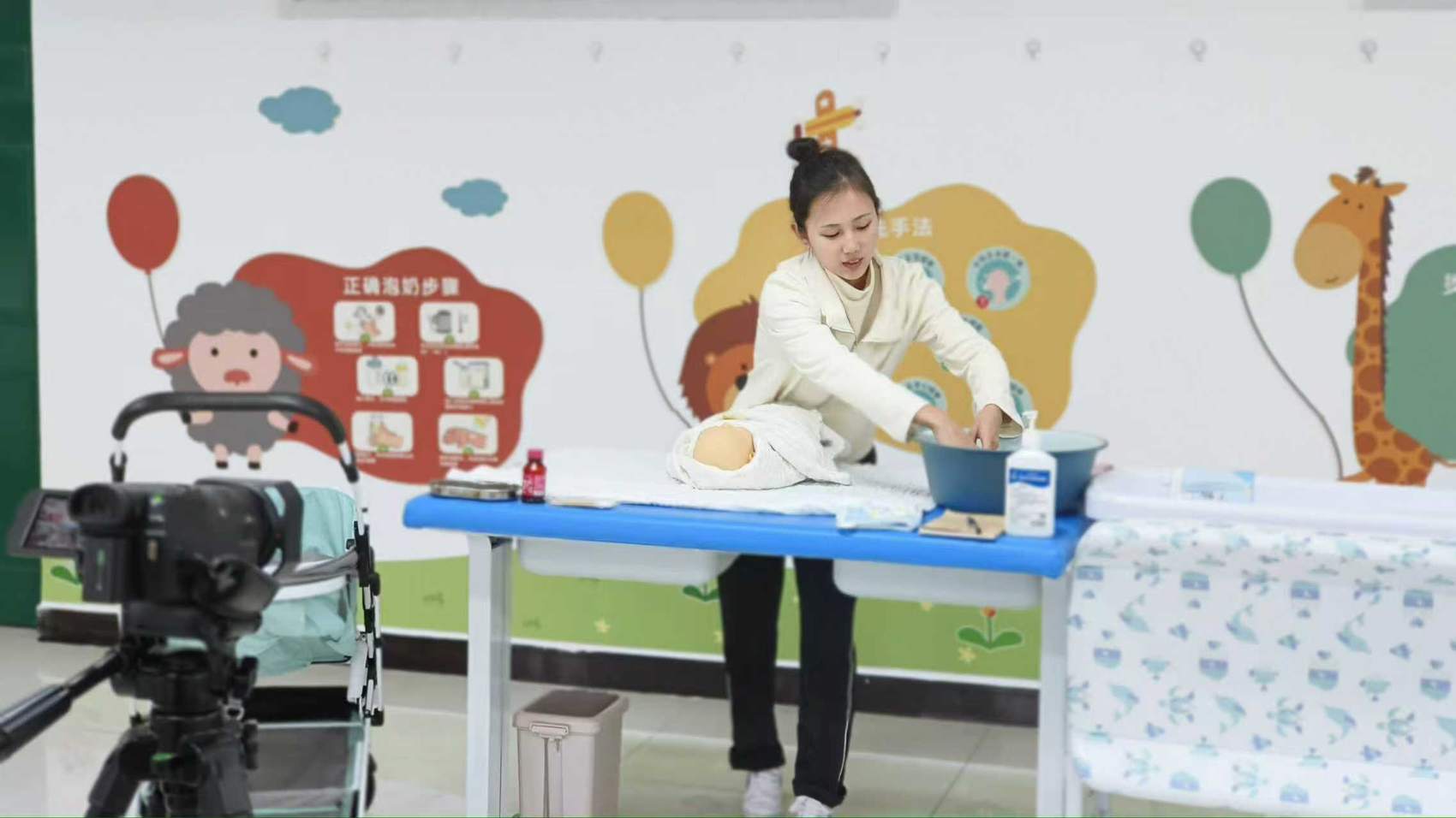 幼兒托育專業的學生正在參加幼兒托育技能訓練。