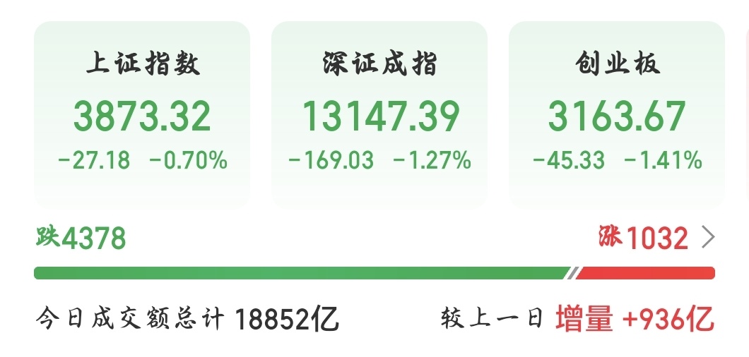 12月11日,不少股民看到行情都有點懵:美聯儲降息的“靴子”明明落地了,A股卻不漲反跌,三大指數齊刷刷往下走。截至收盤,滬指跌0.70%報收3873.32點,深證成指跌1.27%報13147.39點,創業板指跌幅1.41%,收于3163.67點。全市場成交額放量至18852億,較昨日增加936億,量能放大卻難改調整態勢。