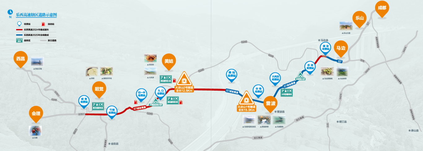 樂(lè)西高速馬昭段串聯(lián)起樂(lè)山峨眉山、涼山邛海、大風(fēng)頂自然保護(hù)區(qū)等優(yōu)質(zhì)文旅資源,在建設(shè)中融入彝族文化元素,沿途設(shè)置文旅觀景臺(tái)、民族風(fēng)情驛站等,首次實(shí)現(xiàn)四川山區(qū)高速“交通+文旅”深度融合。