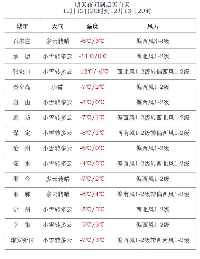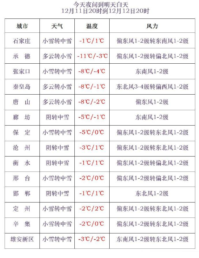 明天白天,全省陰,承德、唐山、秦皇島有小雪,其他地區(qū)有中雪,局地有大雪。最高氣溫,張家口、承德、保定西北部-9~-4℃,其他地區(qū)-3~0℃。