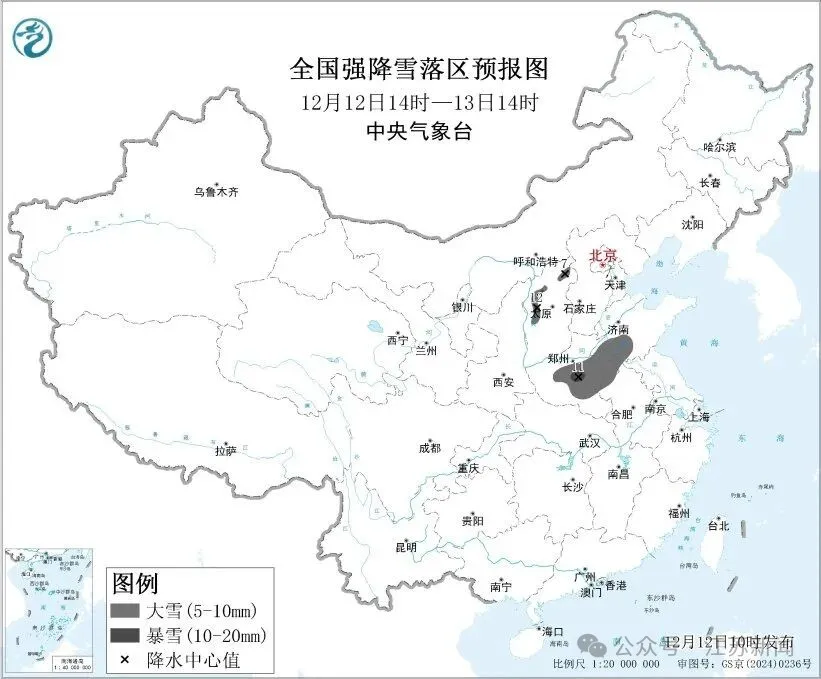 預計12月12日14時至12月13日14時,山西西部和北部、山東西南部、河南中東部和南部、安徽北部、江蘇西北部等地部分地區有大雪,其中,山西西部、河南中部等地局地有暴雪(10~12毫米)。上述部分地區新增積雪深度5~8厘米,局地可達10~15厘米以上。